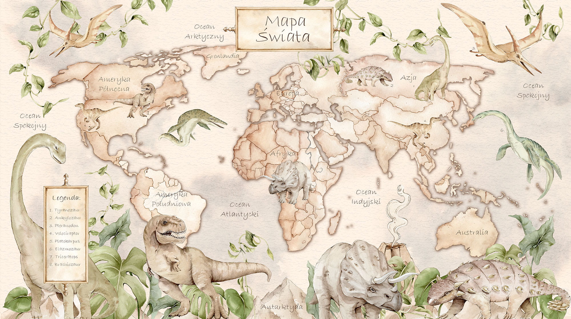 Ta tapeta-mapa świata to prawdziwa uczta dla wyobraźni! Idealnie sprawdzi się w pokojach dziecięcych, zwłaszcza dla tych, które są zarówno pasjonatami eksploracji nowych lądów, jak i miłośnikami dinozaurów. Jest to idealny wybór dla prawdziwych, małych odkrywców, którzy już teraz myślą o kolejnych fascynujących przygodach.