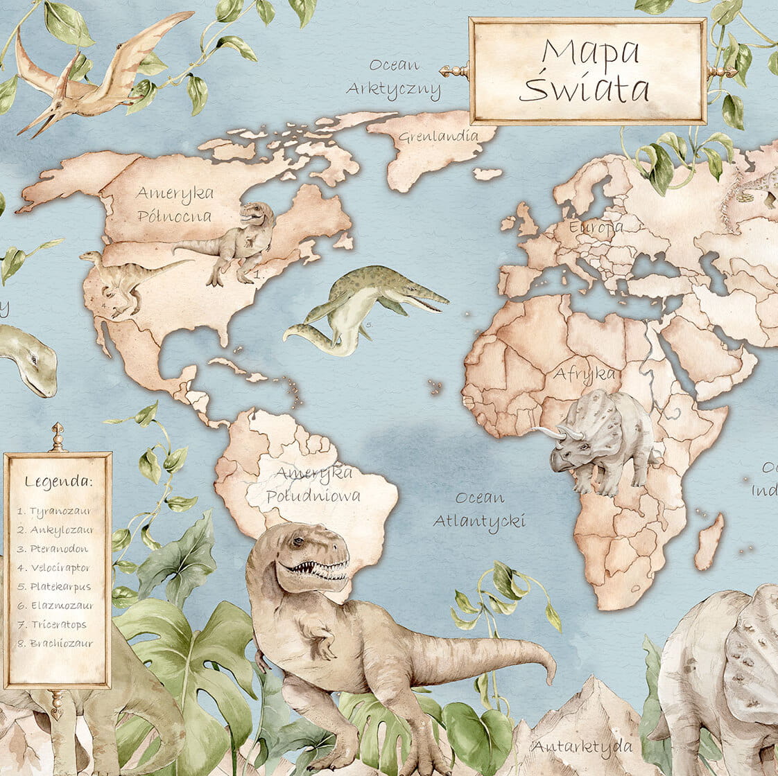 Dzięki tej dekoracji ściennej, dzieci będą mogły przenieść się w świat pełen tajemnic i niespodzianek, odkrywając różnorodność kultur, krajobrazów i przyrody naszej planety. Jednocześnie, obecność dinozaurów na mapie dodaje jej uroku i fascynacji, pobudzając wyobraźnię i zachęcając do zgłębiania wiedzy o prehistorycznych stworzeniach.