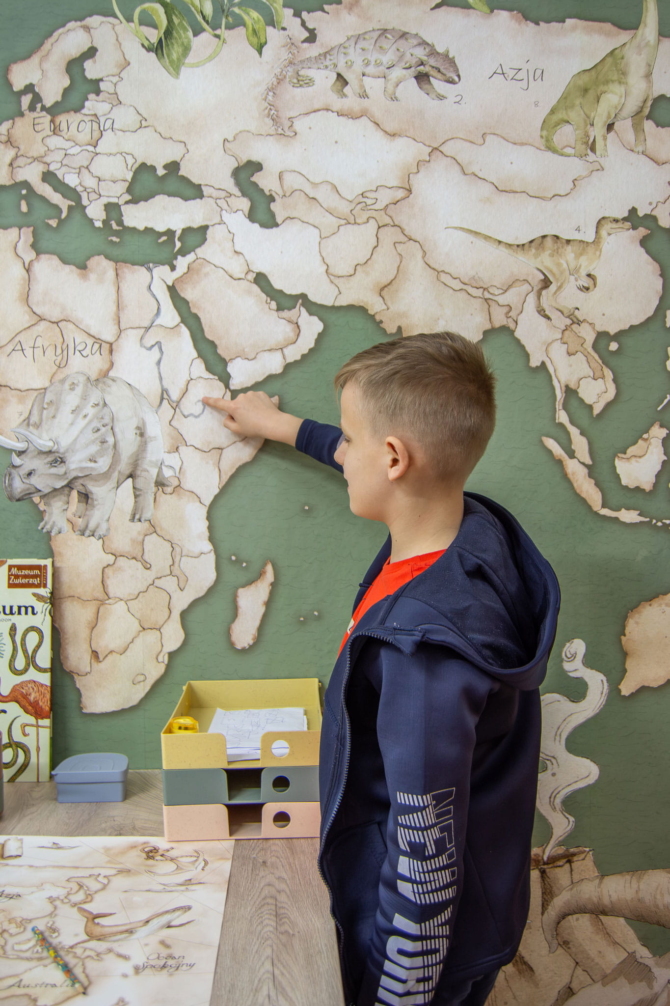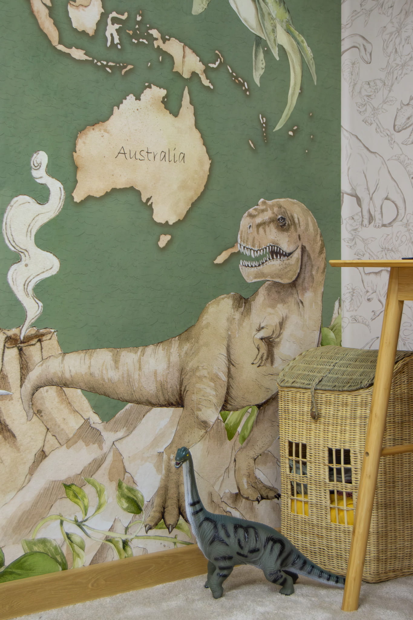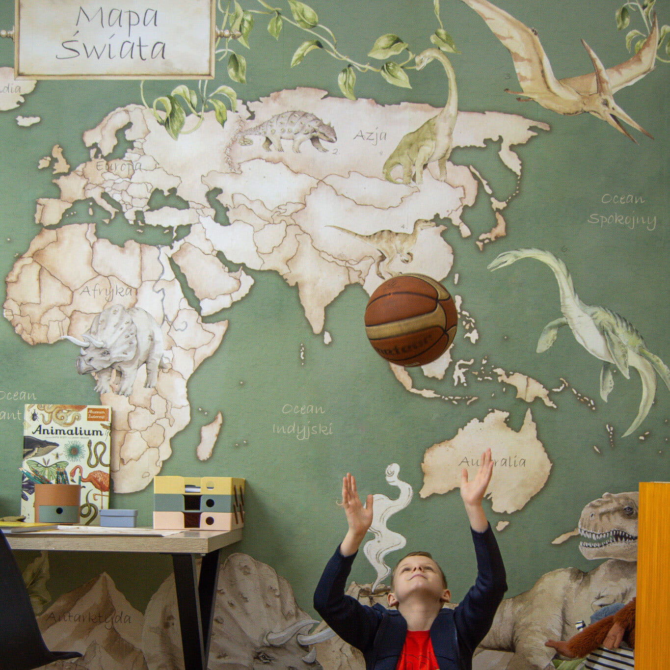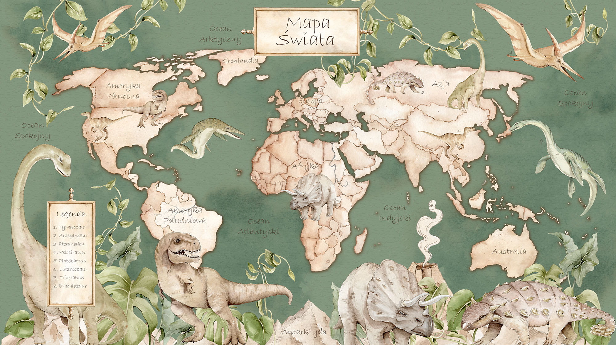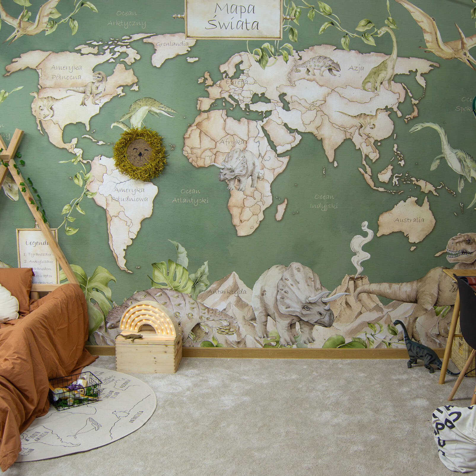 Tapeta do pokoju dziecka Mural Mapa Świata Dinozaury zielona
