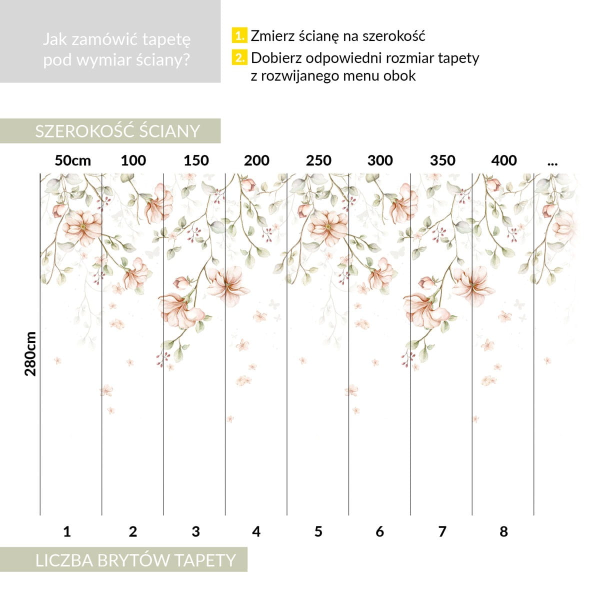 - jak zamówić tapetę? 1. Najpierw należy zmierzyć szerokość ściany. Następnie spójrz na nasz rysunek pomocniczy, gdzie specjalnie zwizualizowaliśmy, jak będzie wyglądać Twoja tapeta przy zamówieniu np. 3 czy 6 brytów (3 bryty = 150cm szerokości, 6 brytów 300cm).