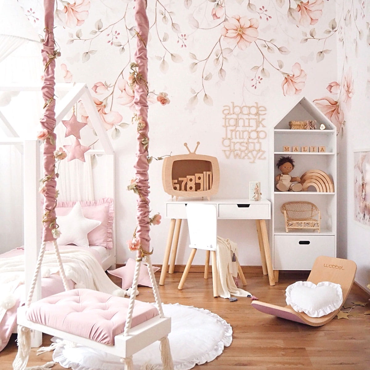 Nasza RAJSKA KOLEKCJA to takie antidotum dla wszystkich, którzy nie zgadzają się na szarugę. To tapety i naklejki, które wyczarują w pokojach klimat… no właśnie… trochę botaniczny, bardzo ciepły, bajkowy i magiczny. To tapety, które pięknie zapełnią ścianę. Stworzone są zgodnie z najnowszym trendem, który podpowiada, aby ściany w pokojach nie pełniły już funkcji jedynie tła, ale wzory na nich nadawały pomieszczeniu charakteru. Stąd mocniejsze kolory, śmielsze wzory, skala maxi. A jednak wciąż pozostajemy w klimacie natury, bo to wzory najbardziej “do życia”. Co jest piękniejszego i… bardziej naturalnego niż sama natura? Tapeta Rajska dżungla gałązki to chyba nasz ulubiony wzór z tej kolekcji. Duże kwiaty, skierowane w dół, które dają wrażenie pochylania się nad kołyską lub łóżkiem. Gwiarantują iście bajkowy i botaniczny klimat. Kwiaty są na białym tle.