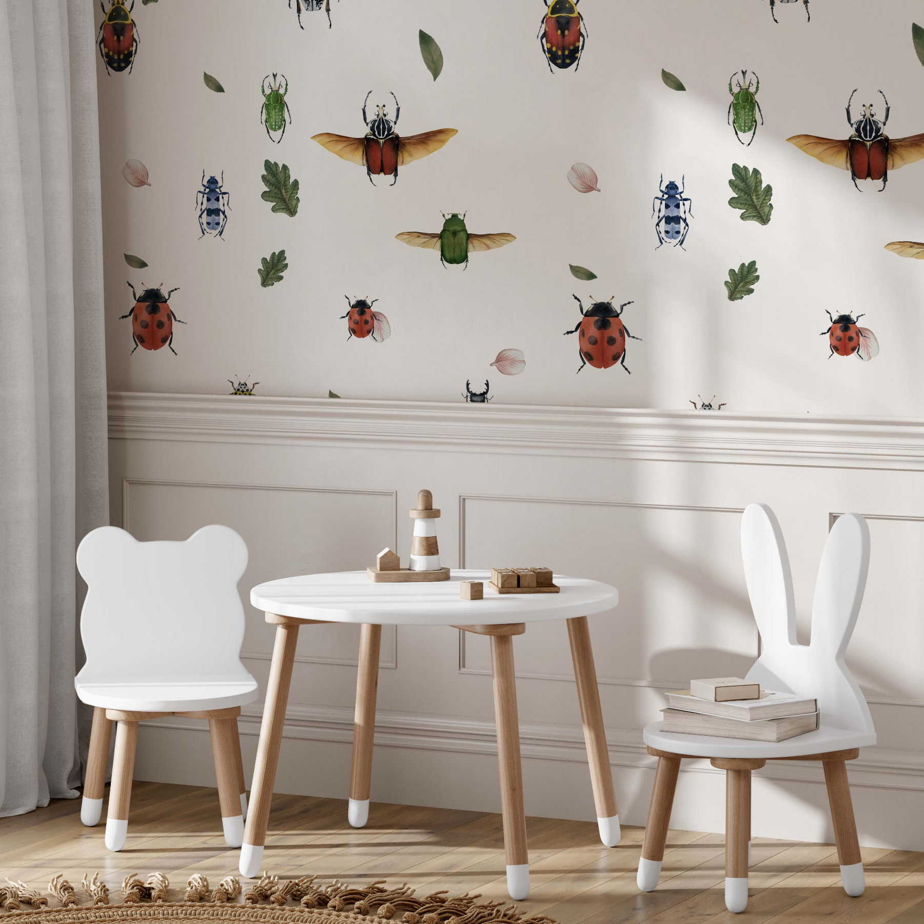 Tapeta do pokoju dziecka z motywem "Robaczki i Listki" może stworzyć wesołą i przyjazną atmosferę, która będzie idealna dla najmłodszych.