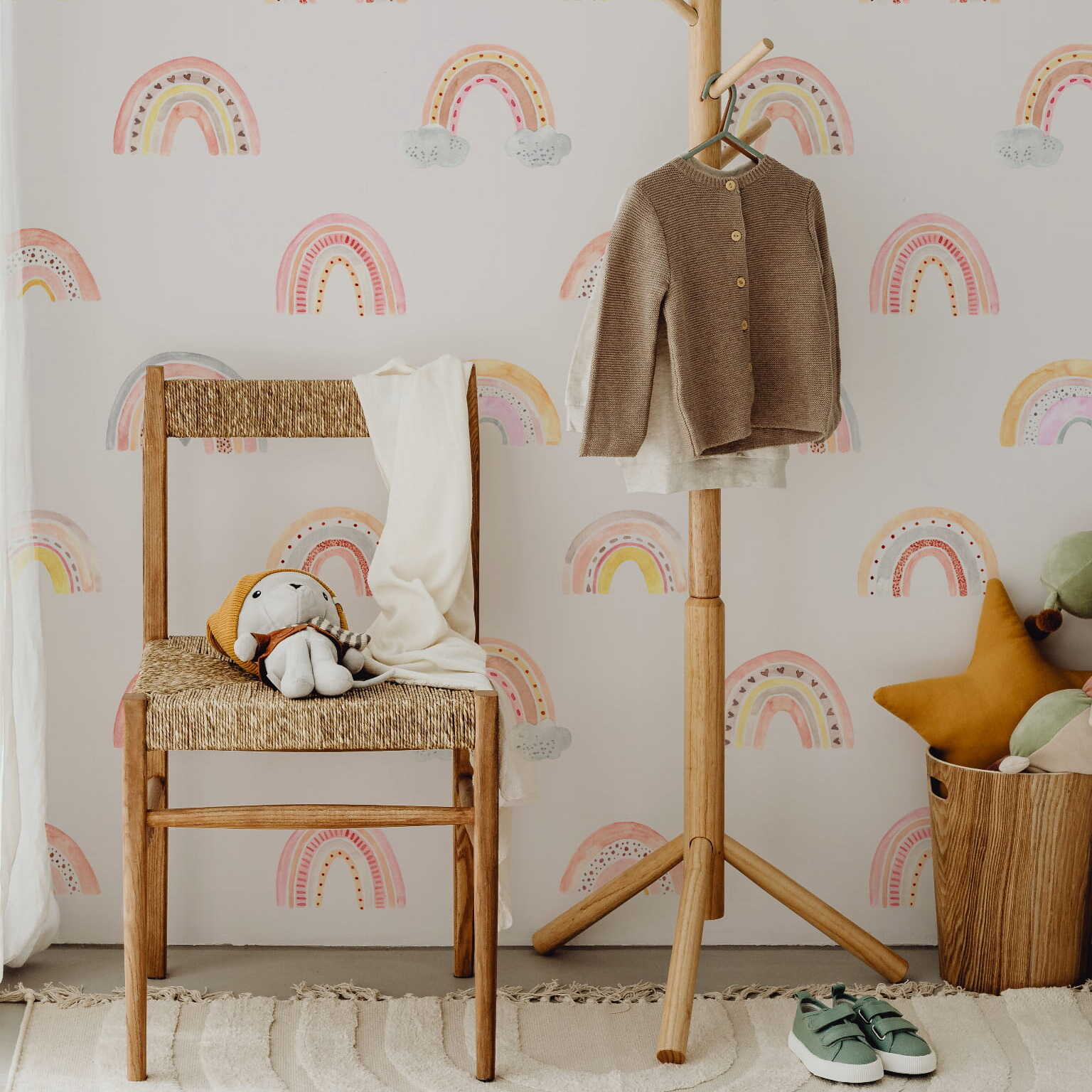 Dodaj uroku i ciepła do pokoju dziewczęcego dzięki naszej tapecie z motywem tęczy! Idealna do stworzenia przytulnej i radosnej atmosfery, tapeta łączy delikatne kolory, które wprowadzą do wnętrza odrobinę magii.