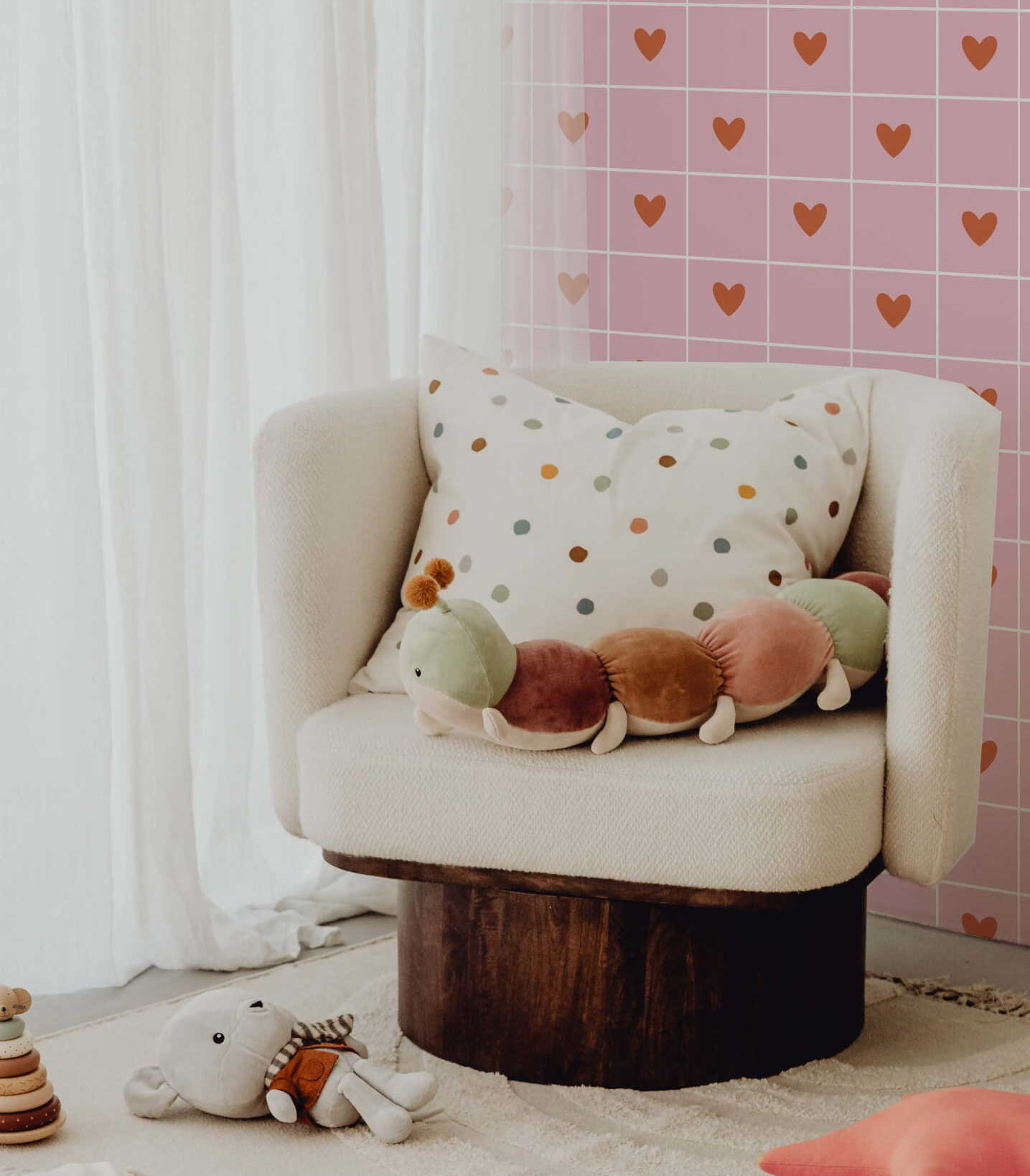 - Kolorystyka: Kolorystyka tapety to przede wszystkim pastelowe odcienie, które wprowadzają do pokoju dziecka spokojną i kojącą atmosferę. Tło może być kremowe lub jasnobeżowe, co dodatkowo podkreśla delikatność i subtelność serduszek oraz kratki. Całość tworzy spokojną, przytulną przestrzeń.
