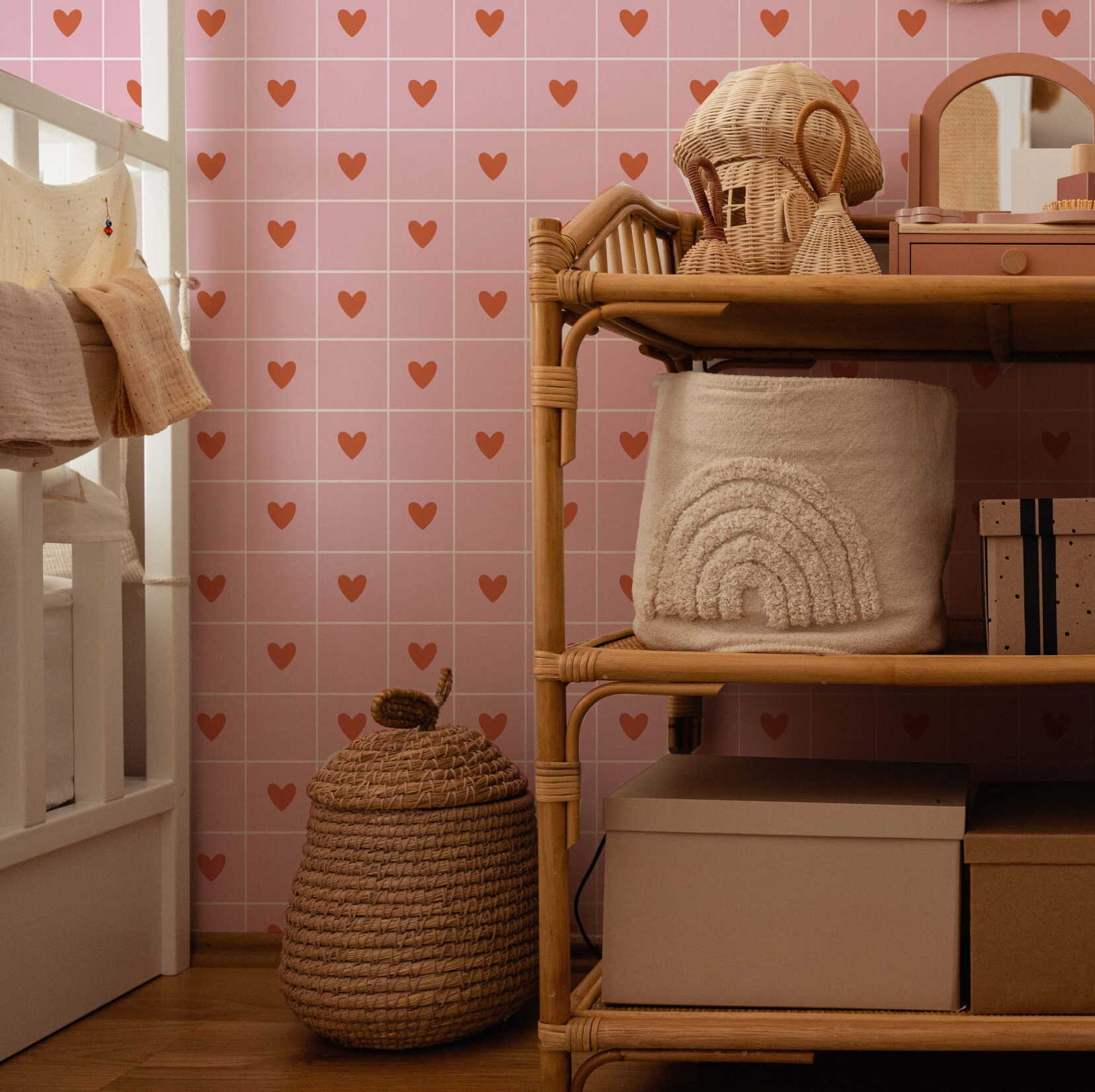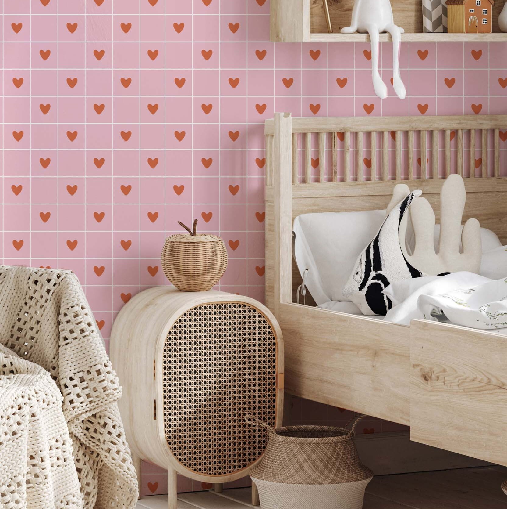 Tapeta do pokoju dziecka z motywem "Serduszka w Kratkę" to urocza i pełna wdzięku propozycja, która doda wnętrzu ciepła i przytulności. To wzór idealny dla rodziców, którzy chcą stworzyć w pokoju dziecka atmosferę pełną miłości i delikatności.