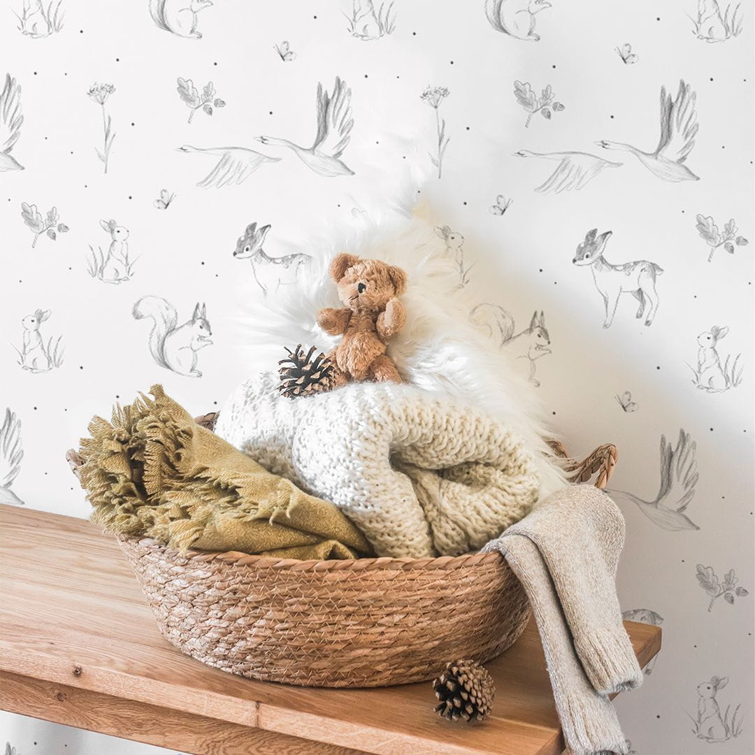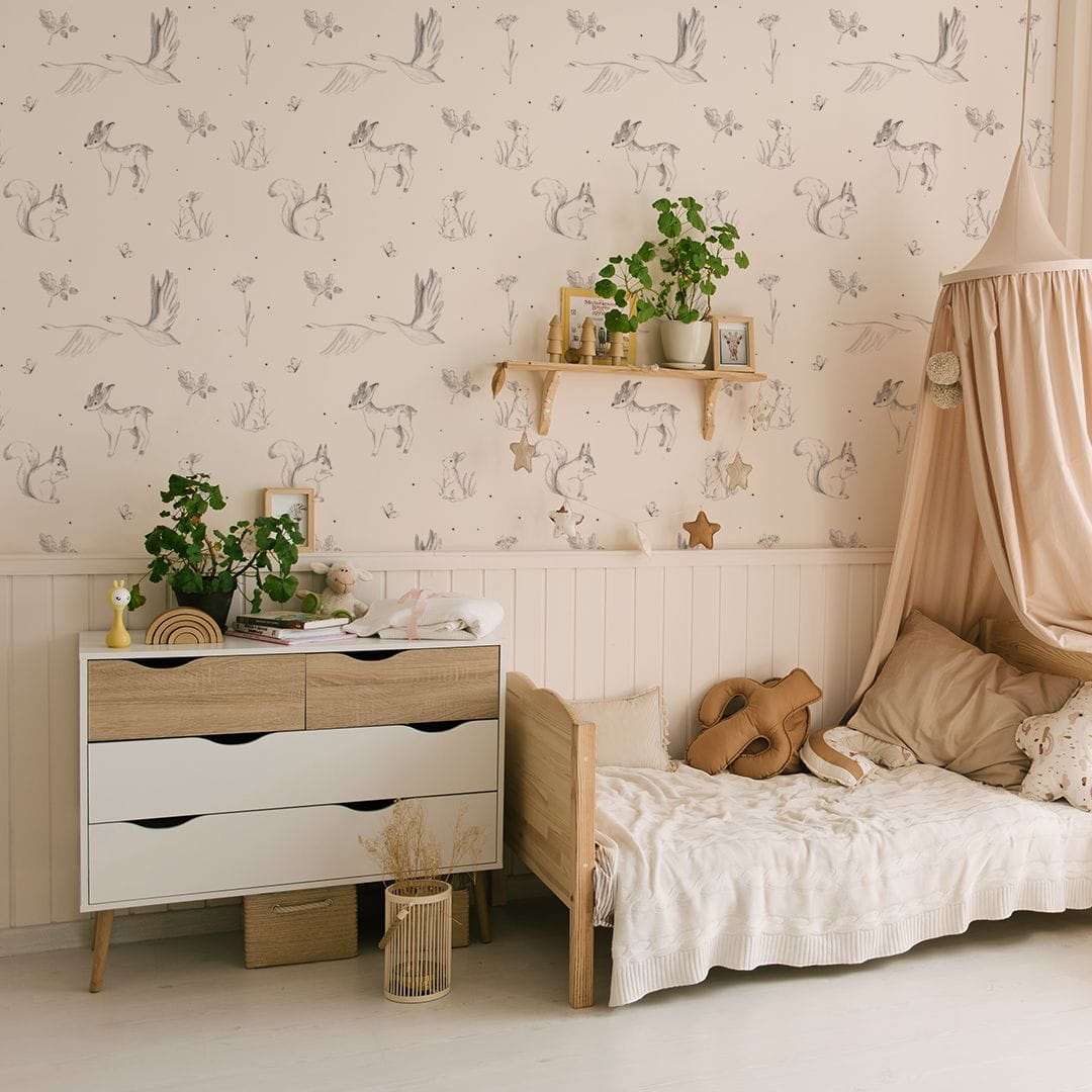 Tapeta winylowa z kolekcji Pencil drawn, dostępna w kolorze czarno-białym lub beżowym, to wyjątkowa dekoracja przeznaczona głównie do wnętrz dziecięcych, ale równie dobrze pasująca do pokojów starszych dzieci czy dorosłych. Delikatne szkice zwierząt, takie jak sarenki, zajączki czy lecące łabędzie, nadadzą ścianom pokoju przytulny i przyjazny charakter.