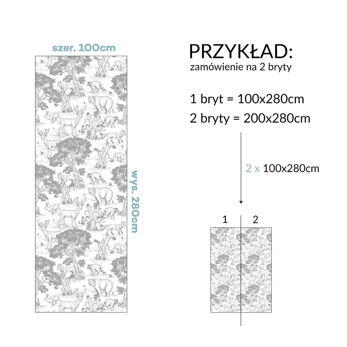 Papier flizelinowy, bez kleju. Papier jest w 100% matowy. Tapetę drukujemy w pasach szerokości 50 cm, które idealnie pasują do siebie. Tapetę kleimy jeden pas obok drugiego, z linią styczną (pasy nie nakładają się na siebie). Materiał posiada certyfikat o niepalności oraz spełnia wszelkie wymogi Unii Europejskiej.