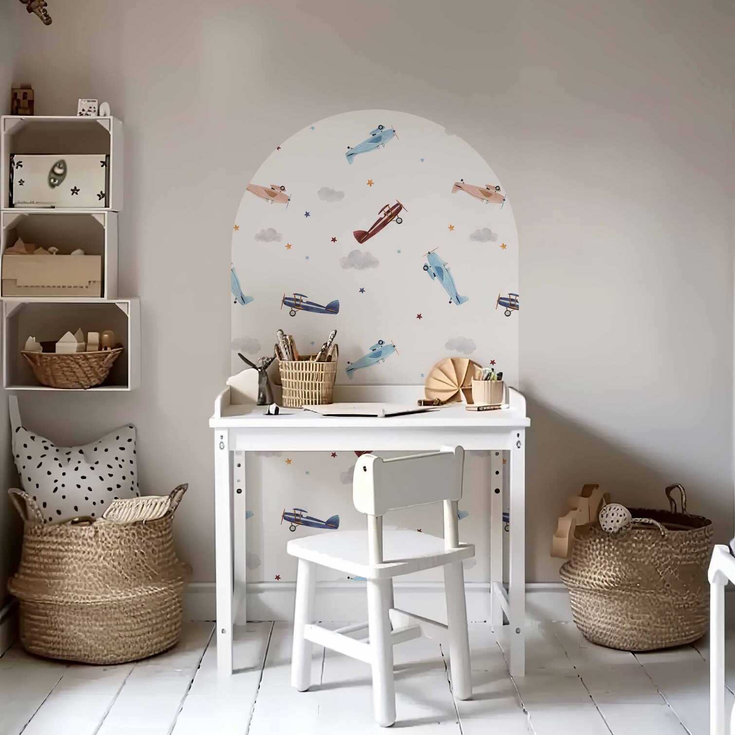 Wzbuj w wyobraźnię swojego dziecka i przenieś je w świat nieograniczonych przygód z tapetą Łuki Samoloty! Doskonała do pokoju małego marzyciela, ta tapeta z motywem samolotów w łukach wprowadzi do wnętrza lekkość i radość, a także pomoże stworzyć przestrzeń pełną pasji i inspiracji do zabawy. To idealny wybór dla każdego malucha, który uwielbia podróże, niebo i marzenia o lataniu.