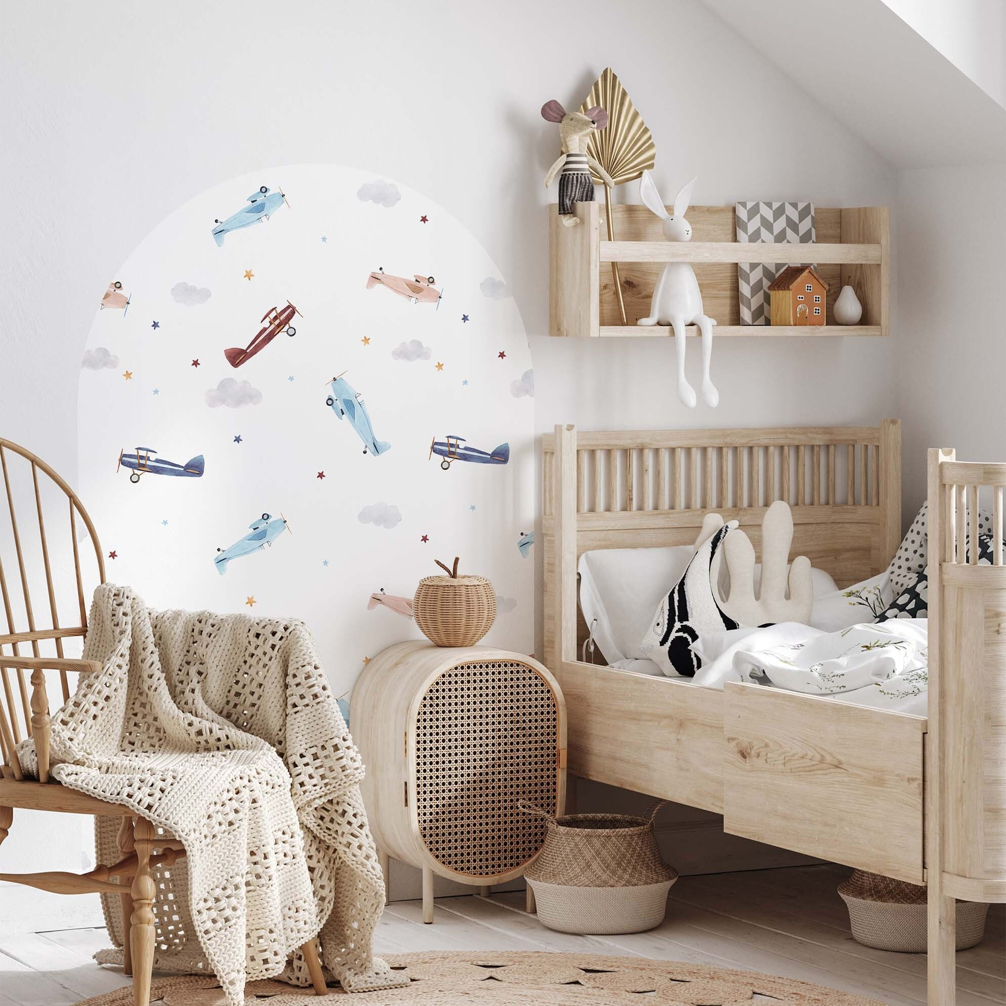 Motyw samolotów w łukach: Kolorowe, urocze samoloty w stylowych łukach dodają pokoju dziecka lekkości, radości i fantazji, a także inspirują do marzeń o podróżach.