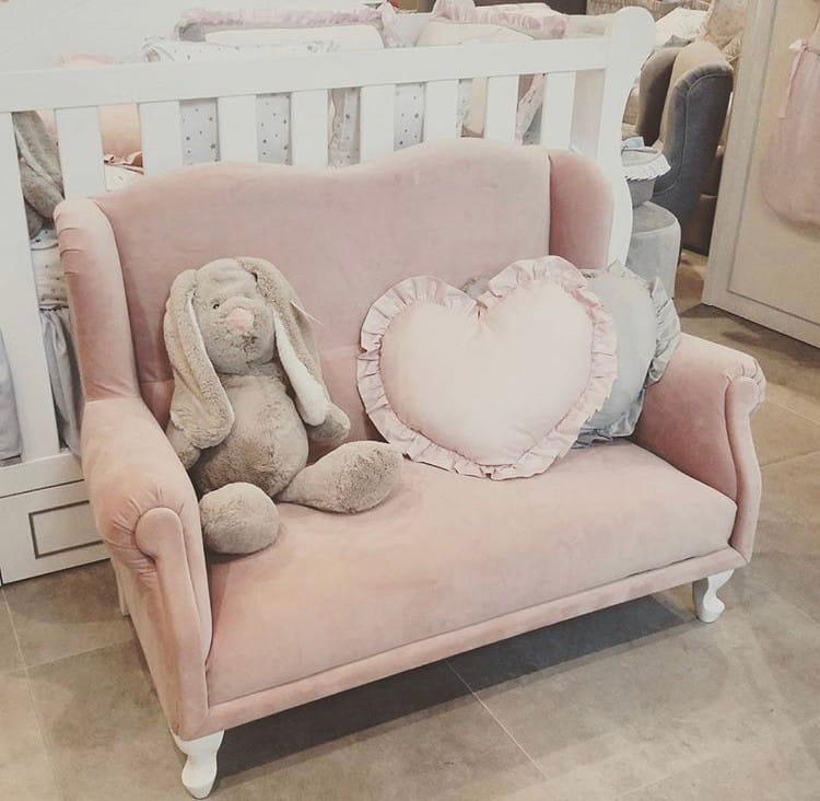 Piękna sofa do pokoju dziecka, w miniaturowym dziecięcym rozmiarze. Wyjątkowy mebel, którym można się tylko zachwycać i który doda uroku do każdego dziecięcego pokoju czy kącika.