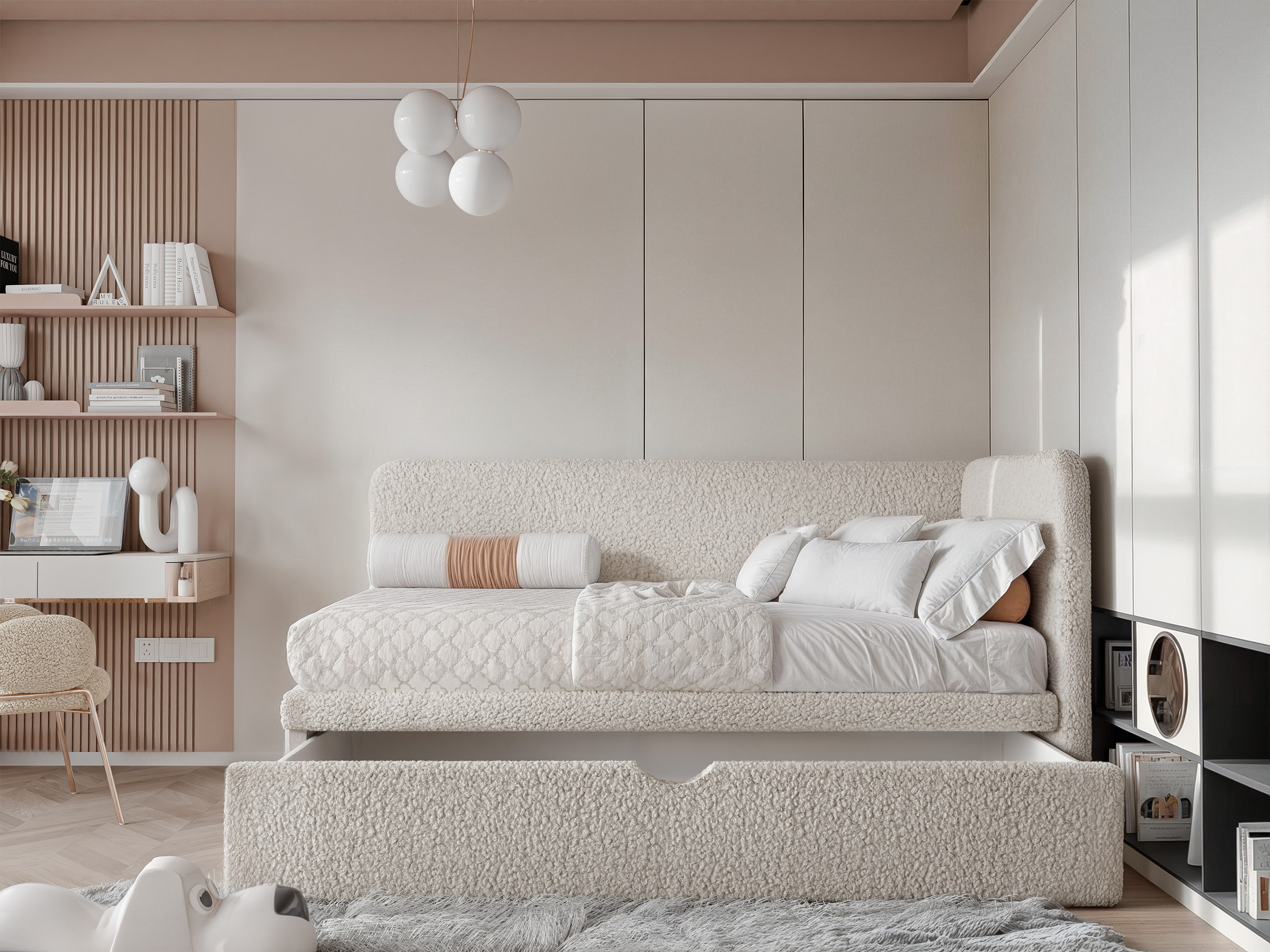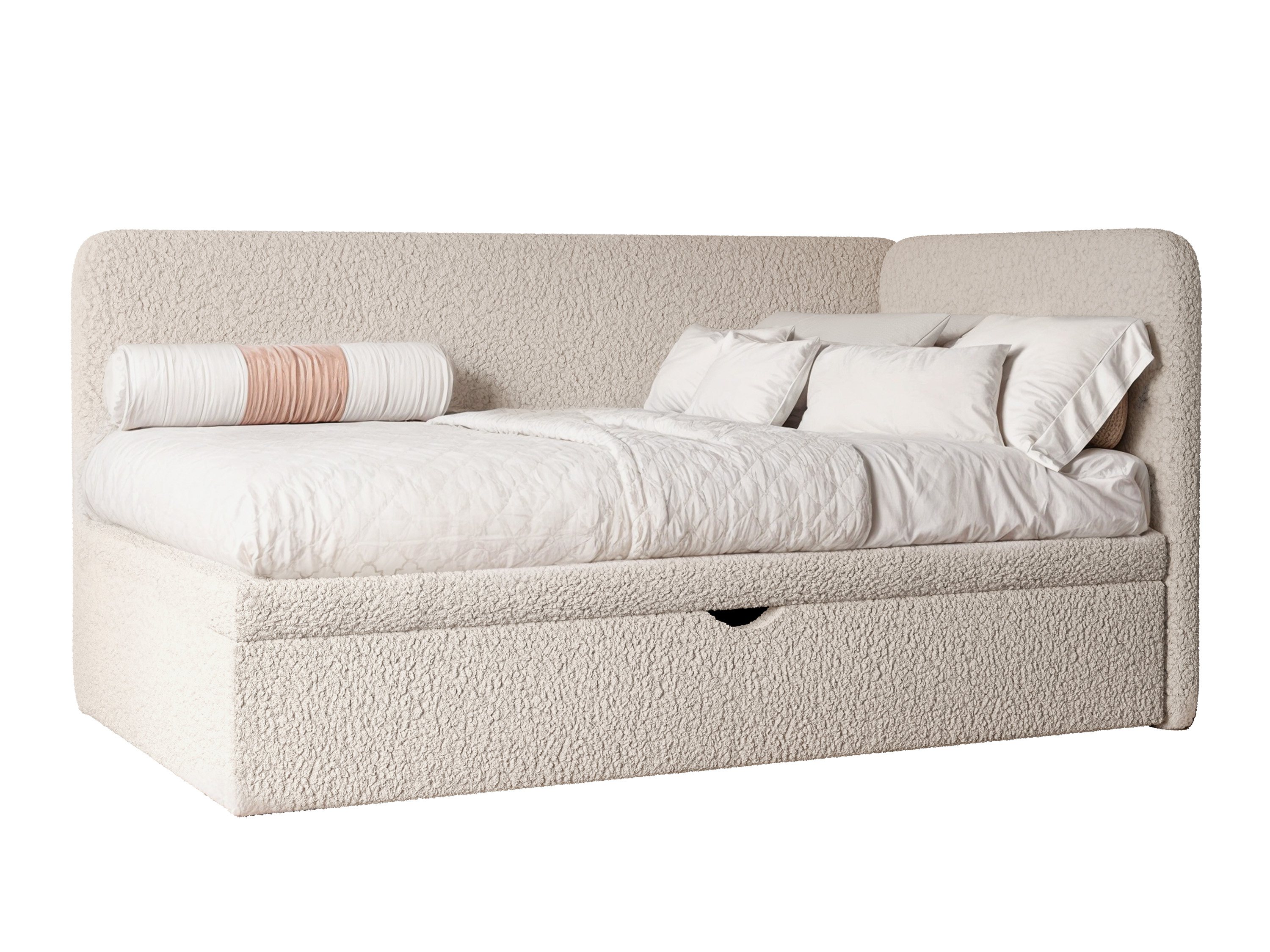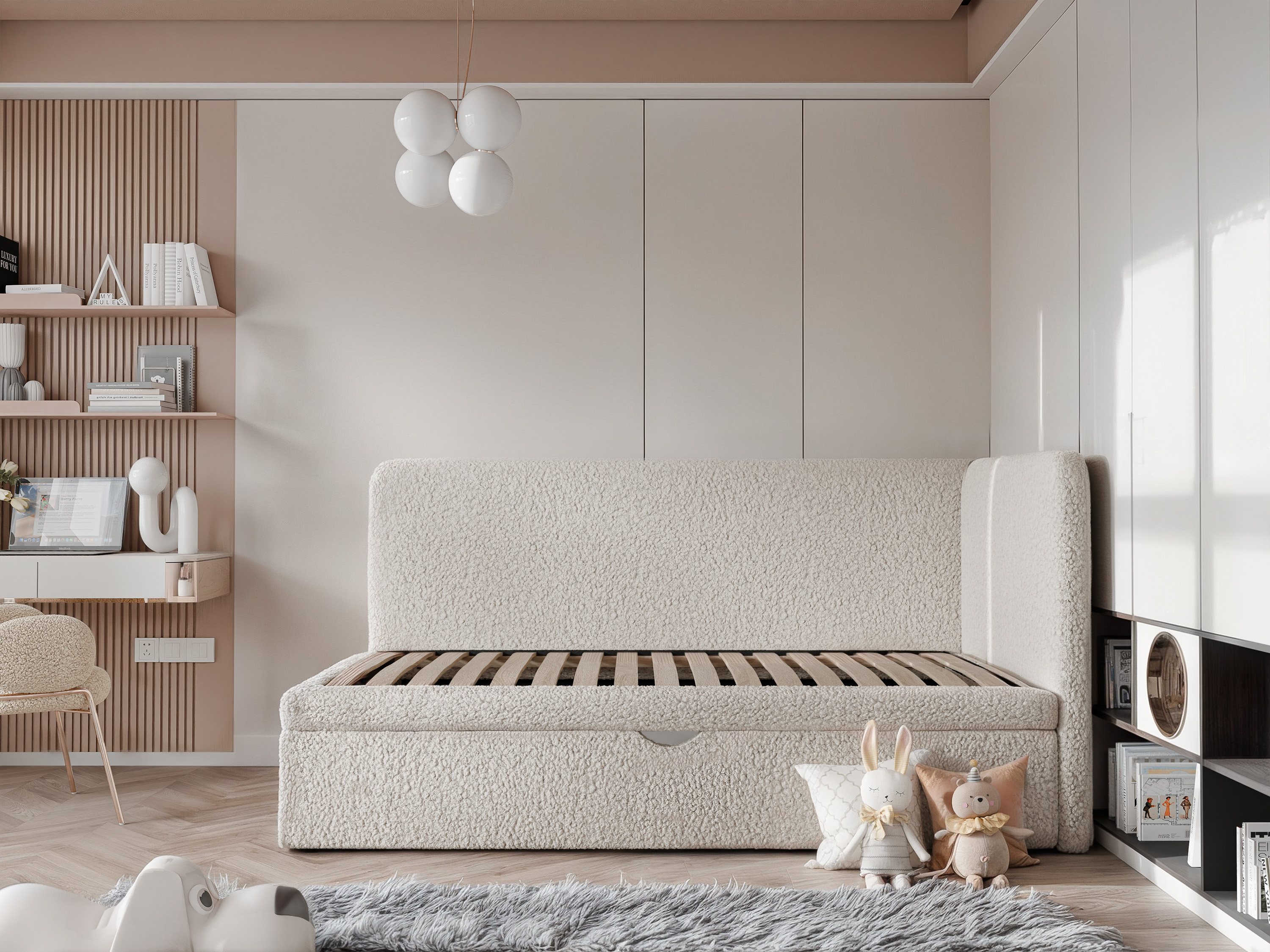 Tapicerowane łóżko Everest to stylowe i wyjątkowo przytulne rozwiązanie — wykonane z tkaniny bouclé o „misiowym” wyglądzie, dostępne w różnych rozmiarach i kolorach, idealne do pokoju dziecka lub nastolatka.