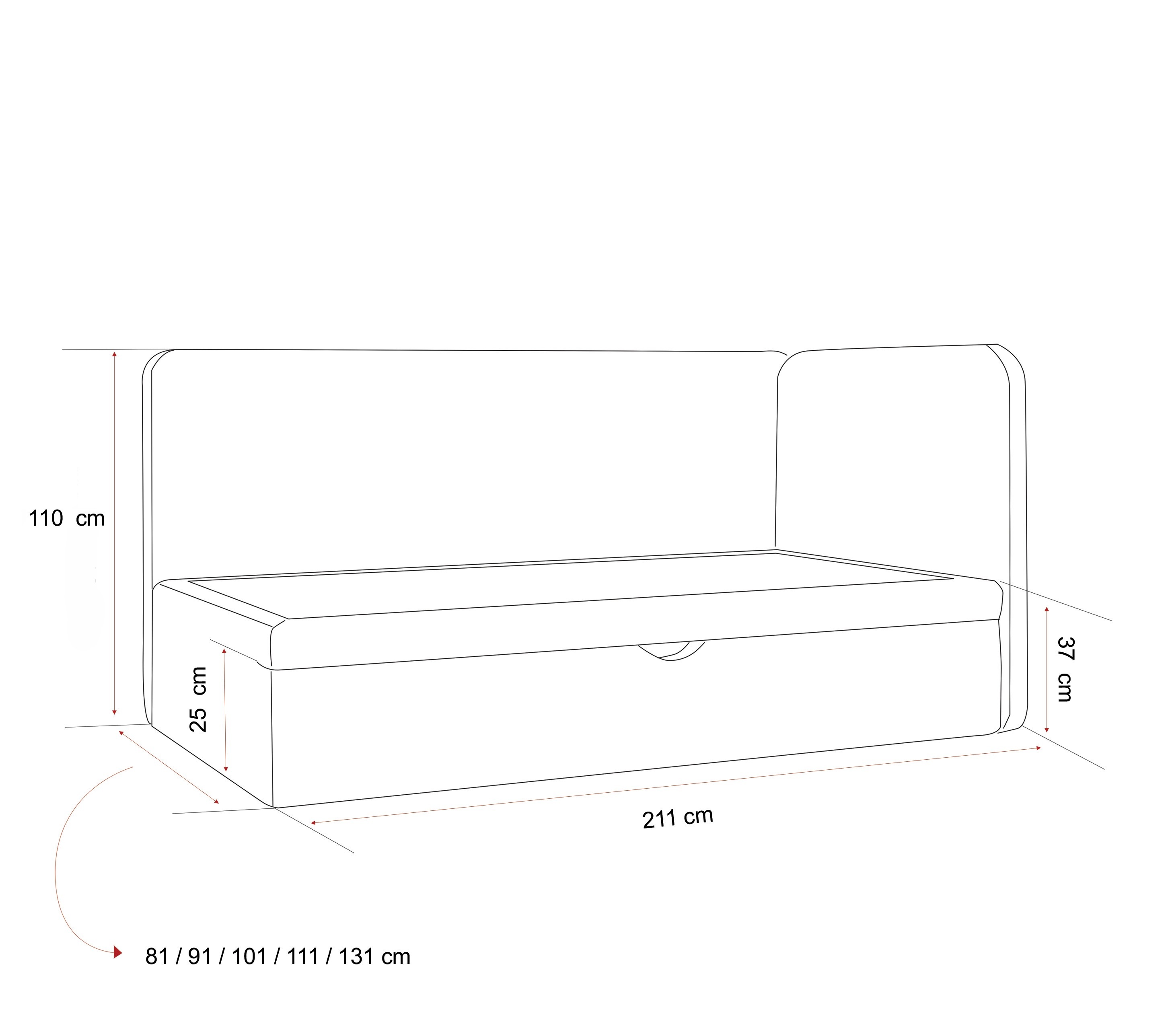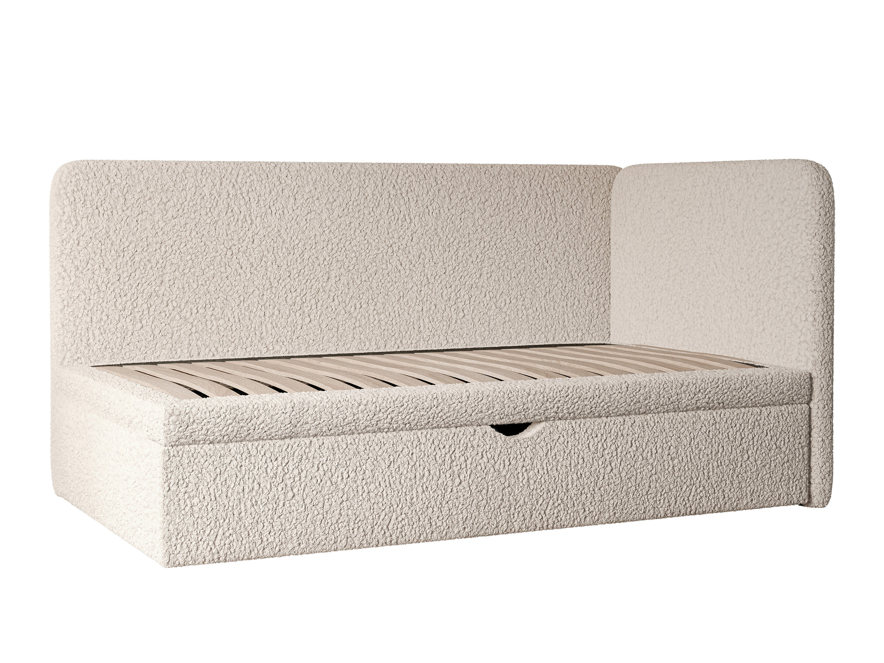 Model Everest wyróżnia się miękką, teksturowaną tkaniną bouclé („baranek”) oraz wysokim zagłówkiem, który nadaje wnętrzu elegancji i tworzy komfortową przestrzeń do odpoczynku. Tapicerowane boki oraz możliwość wyboru wysokości i strony zagłówka pozwalają na dopasowanie mebla do indywidualnych potrzeb.