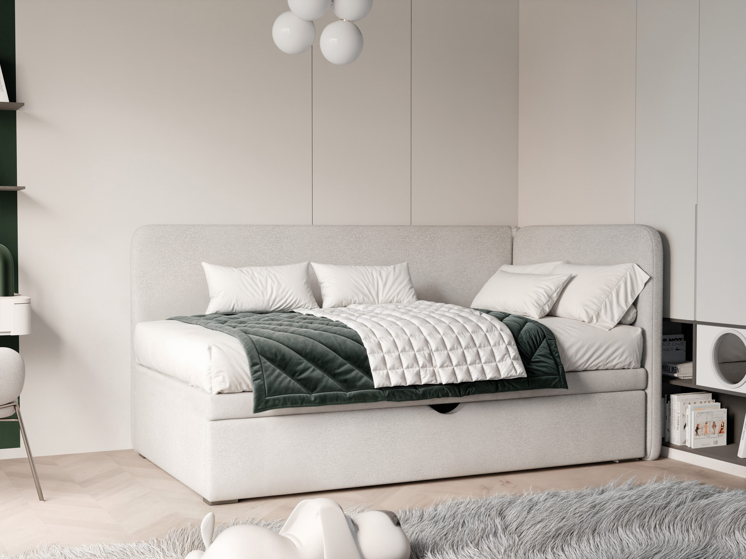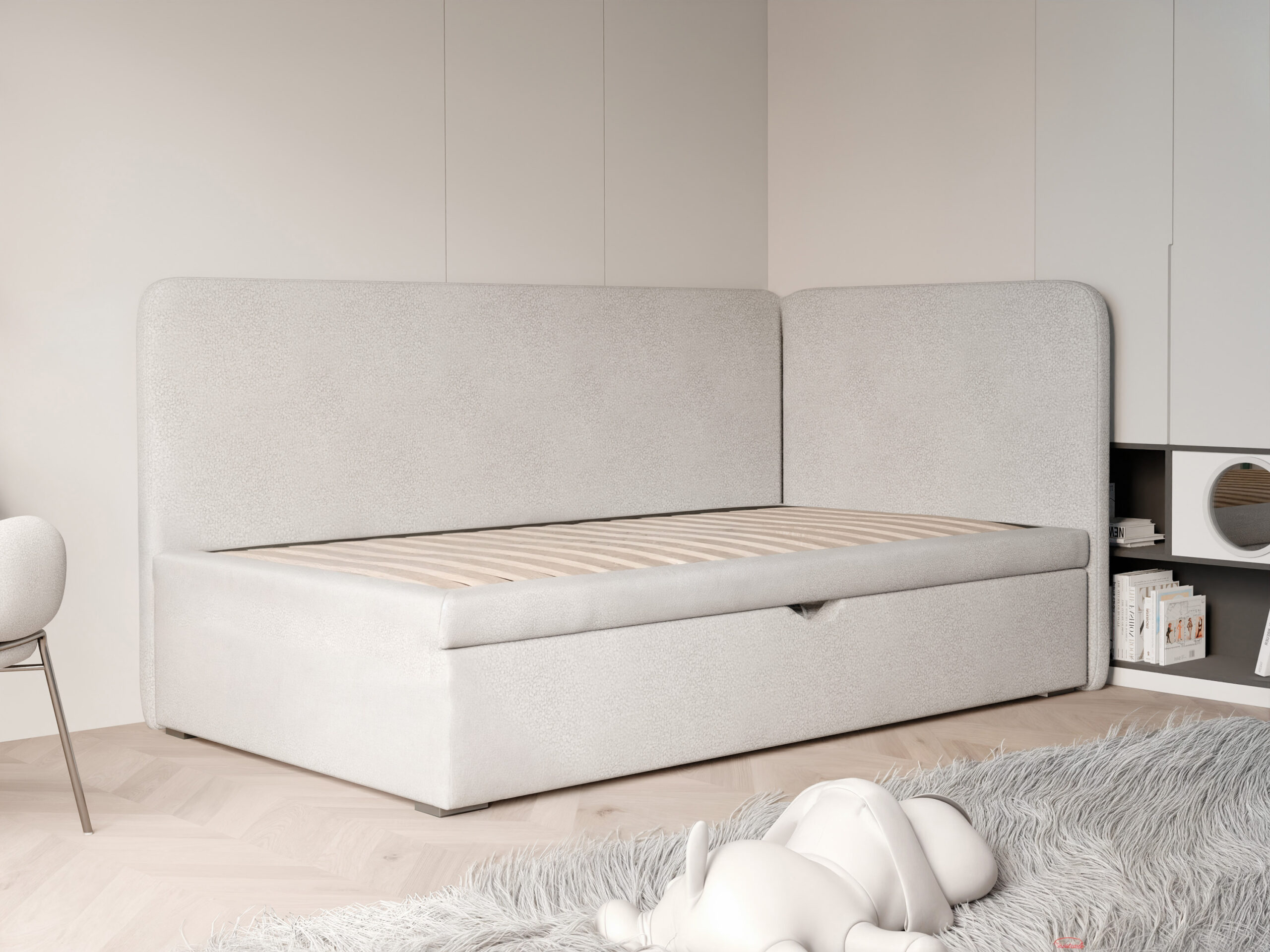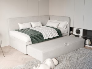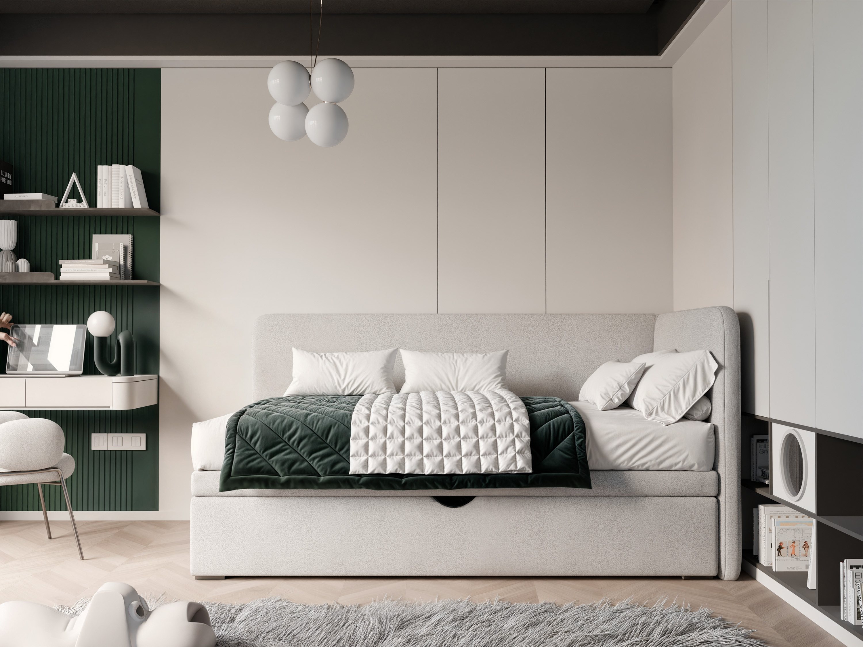 Nowoczesne, tapicerowane łóżko ZUMA z dodatkową wysuwaną powierzchnią do spania i praktyczną szufladą — idealne rozwiązanie dla rosnącego dziecka i dynamicznego pokoju dziecięcego.