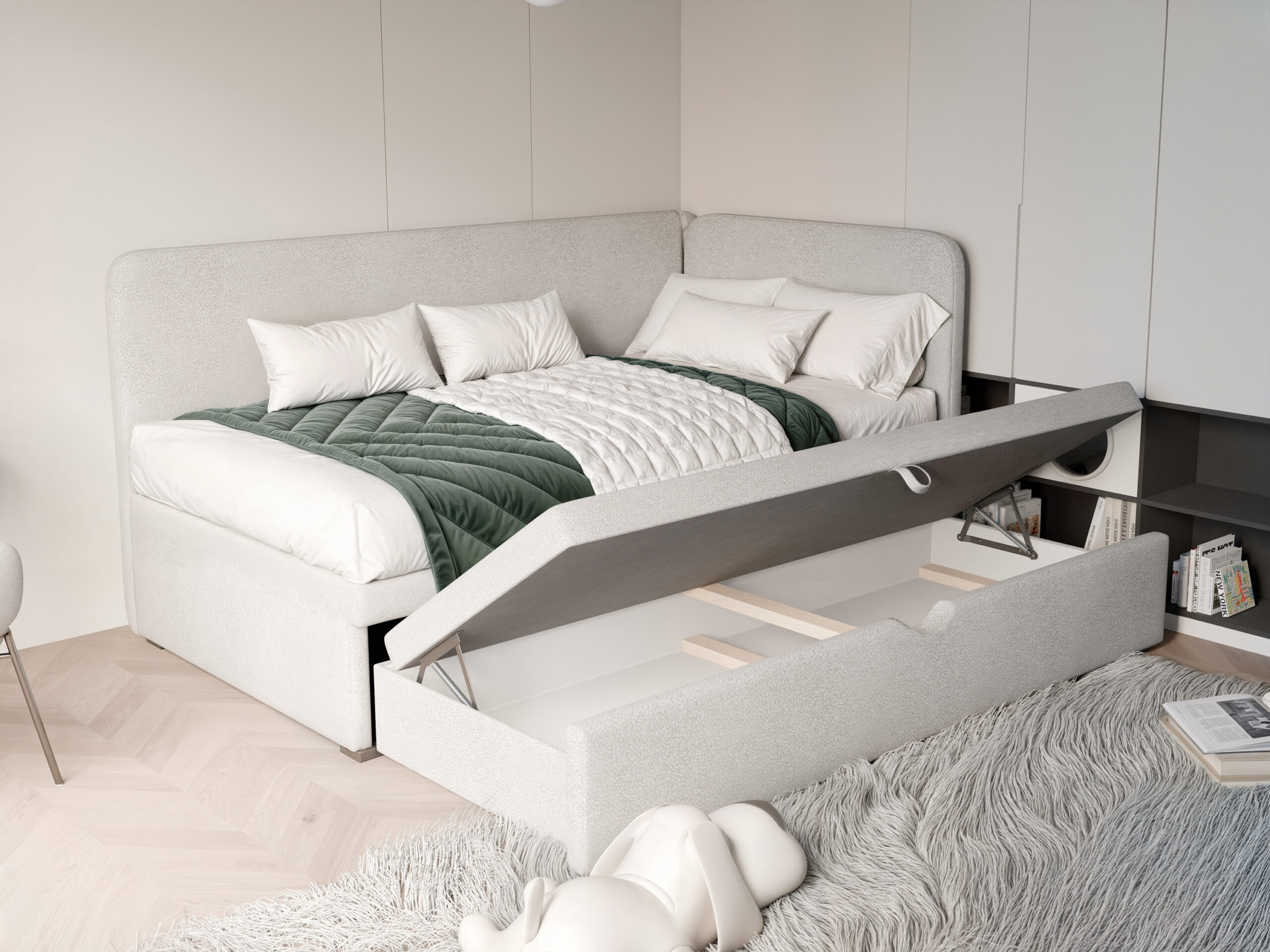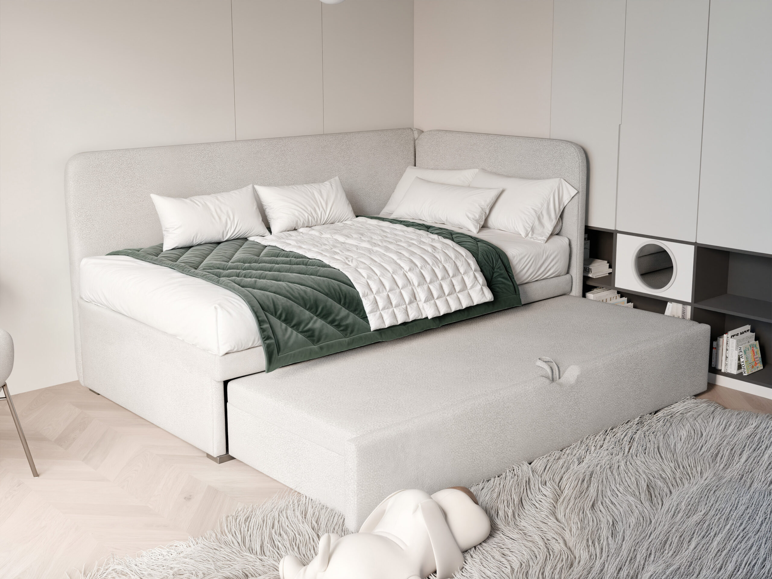 Stylowe tapicerowanie oraz możliwość wyboru tkaniny, koloru, strony wysuwania (lewa lub prawa) oraz rozmiaru powierzchni spania czynią ZUMA bardzo elastyczną propozycją. Dzięki stonowanej formie i wysokiej jakości wykończeniu łóżko świetnie wpisuje się w różnorodne aranżacje wnętrz — zarówno w pokoju dziewczynki, chłopca, jak i pomieszczeniu uniwersalnym.