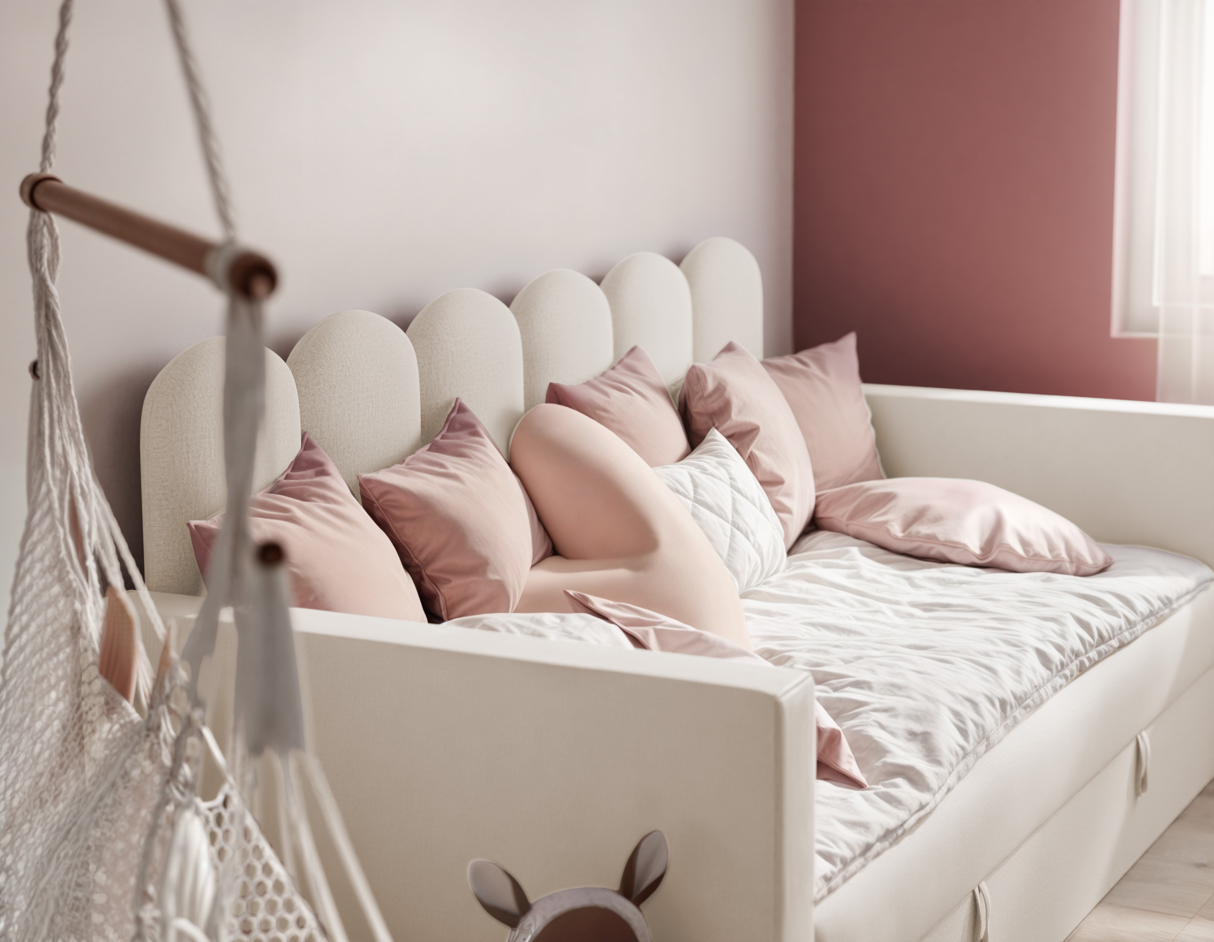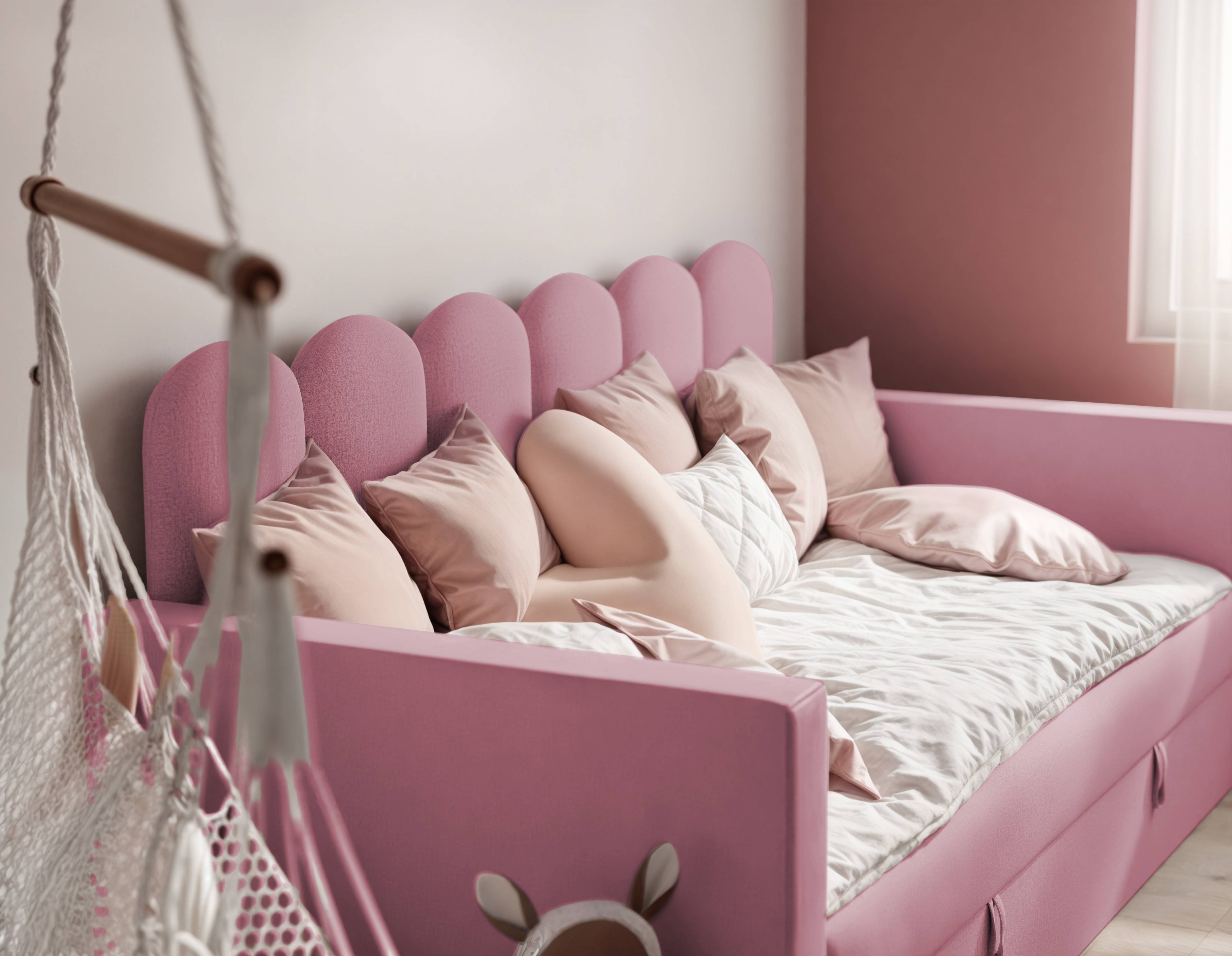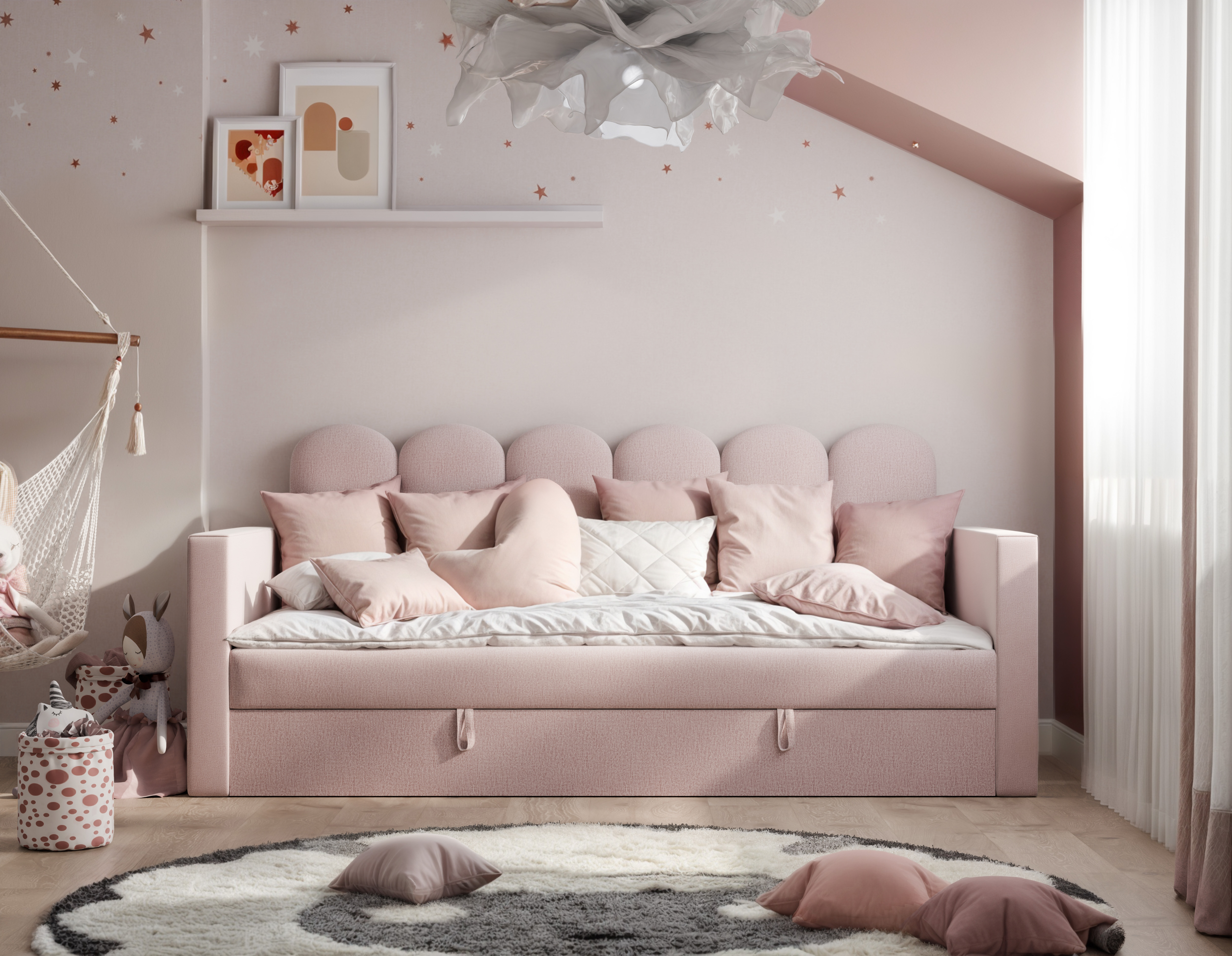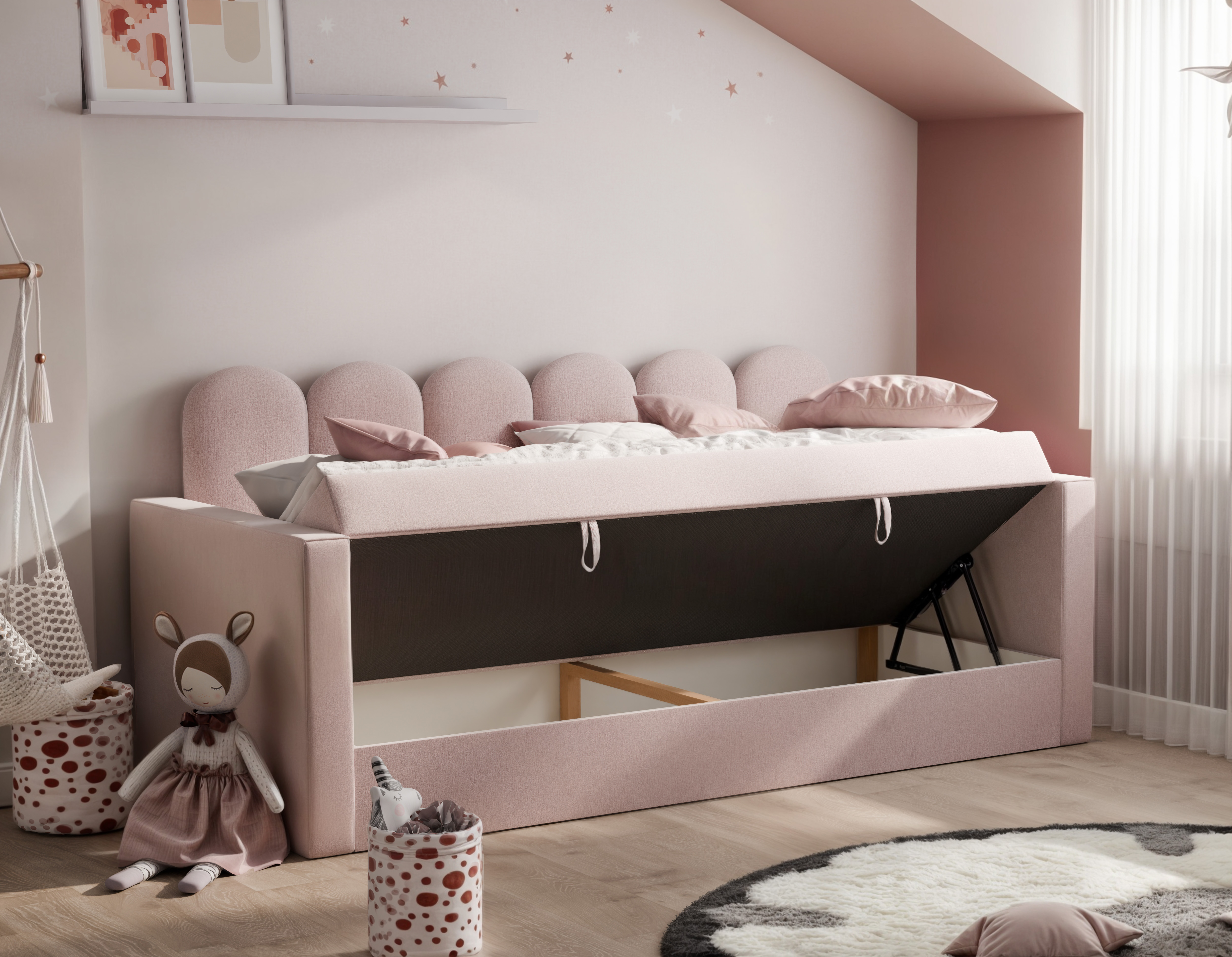 Eleganckie łóżko ALIA III — tapicerowane, z wbudowanym materacem, pojemnikiem na pościel i funkcją dziennej sofy — idealne do pokoju dziecka lub nastolatka.