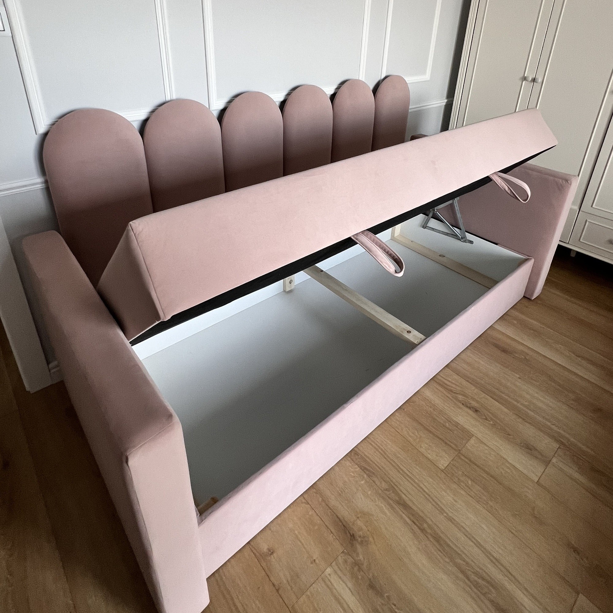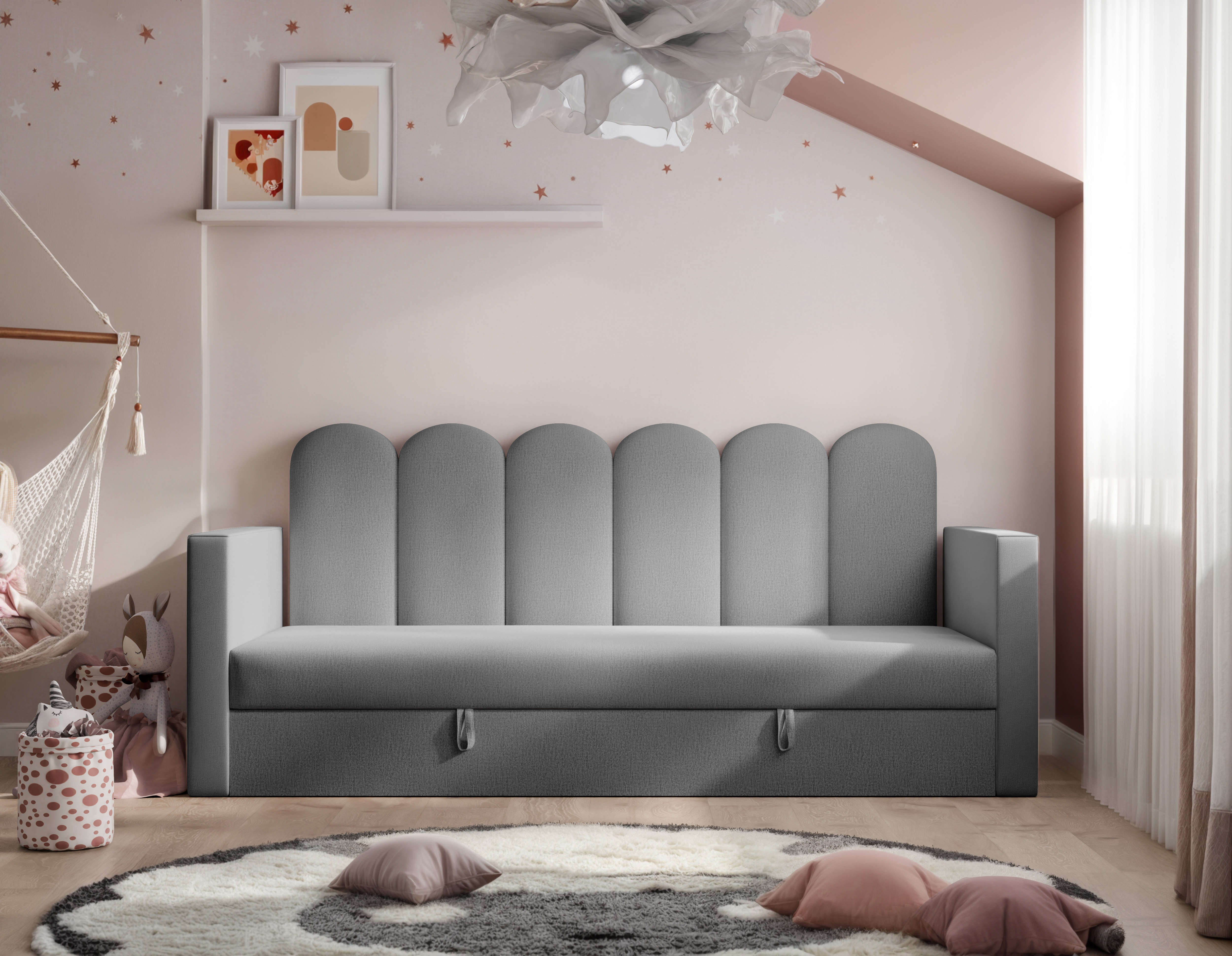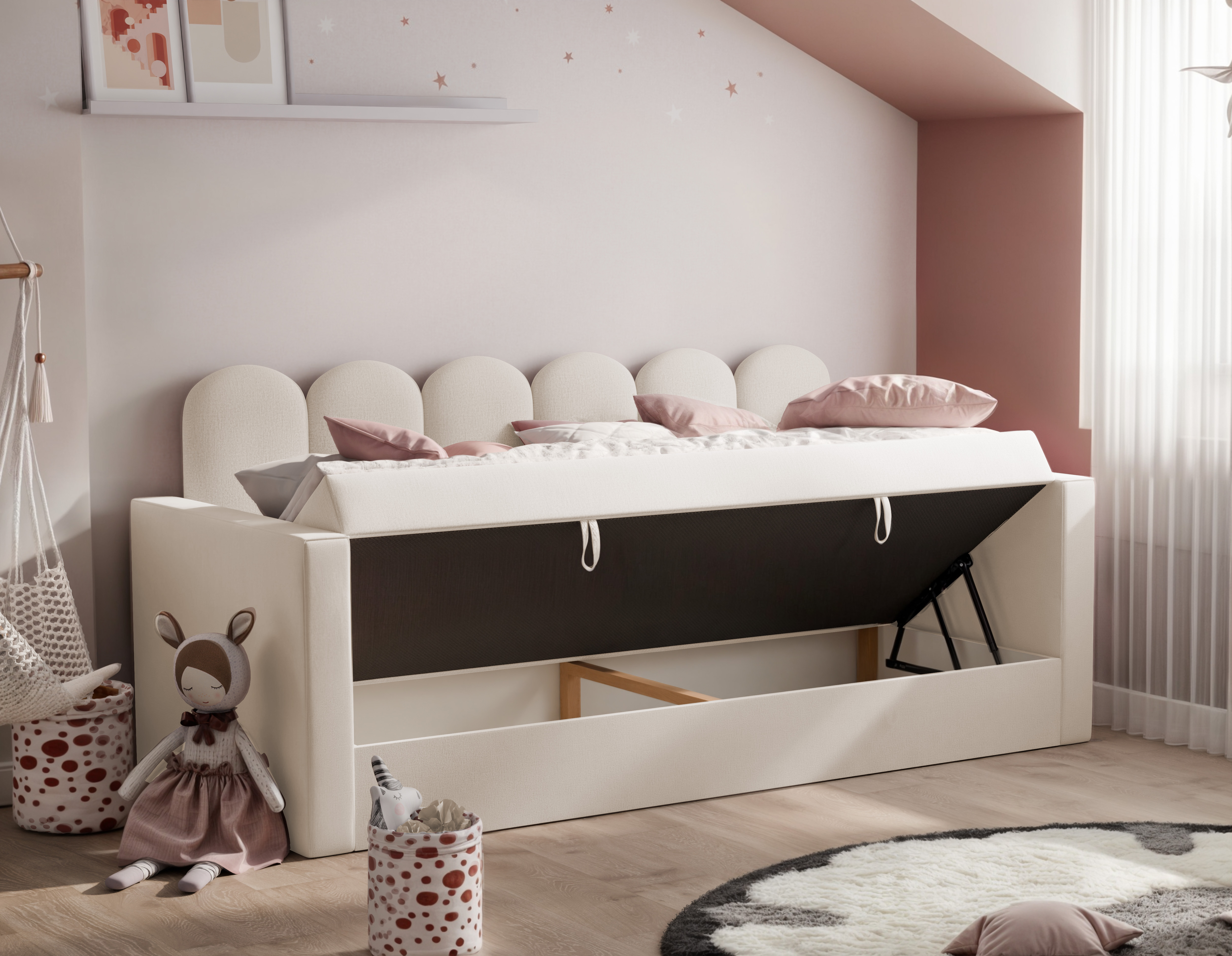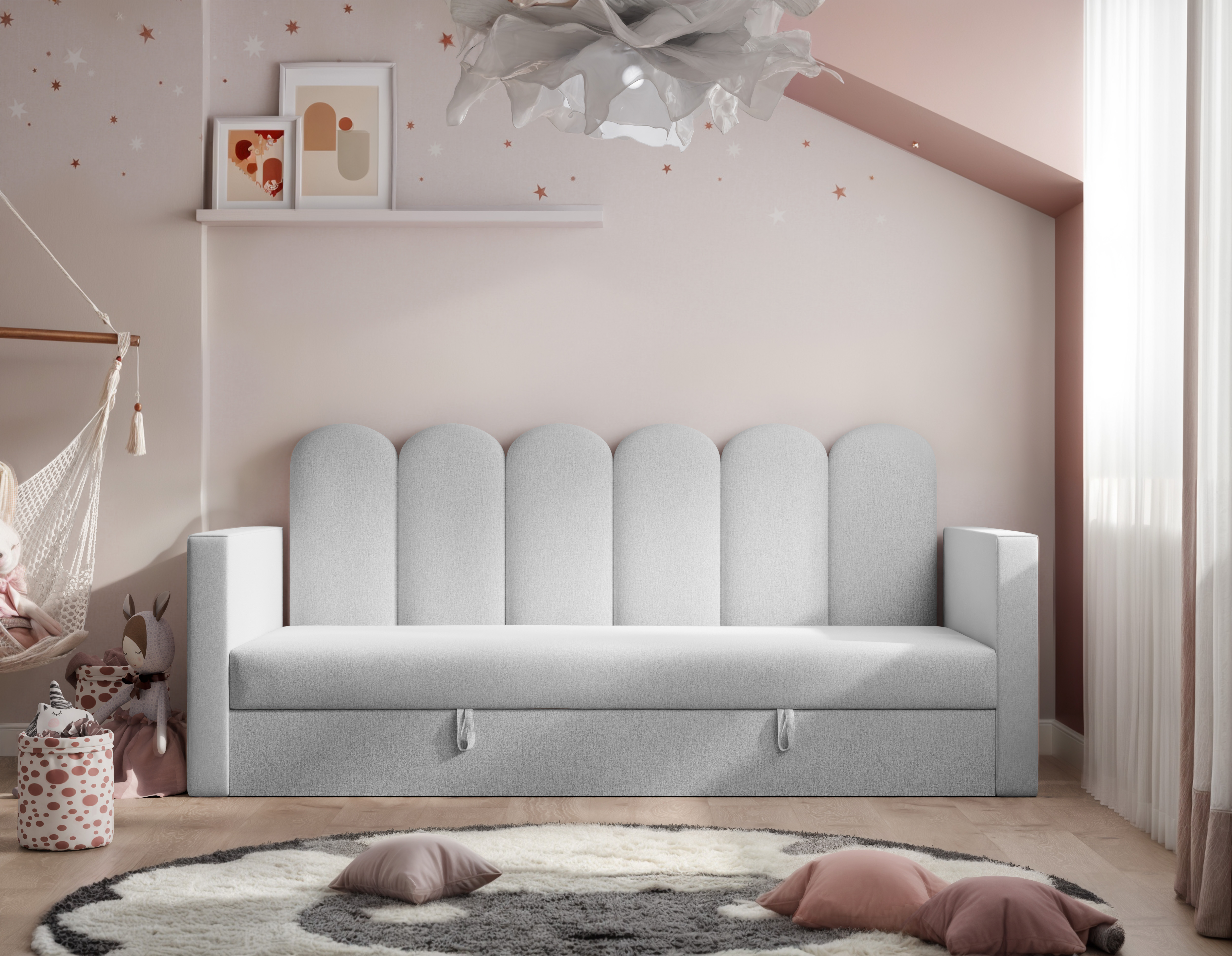 Eleganckie łóżko ALIA III — tapicerowane, z wbudowanym materacem, pojemnikiem na pościel i funkcją dziennej sofy — idealne do pokoju dziecka lub nastolatka.