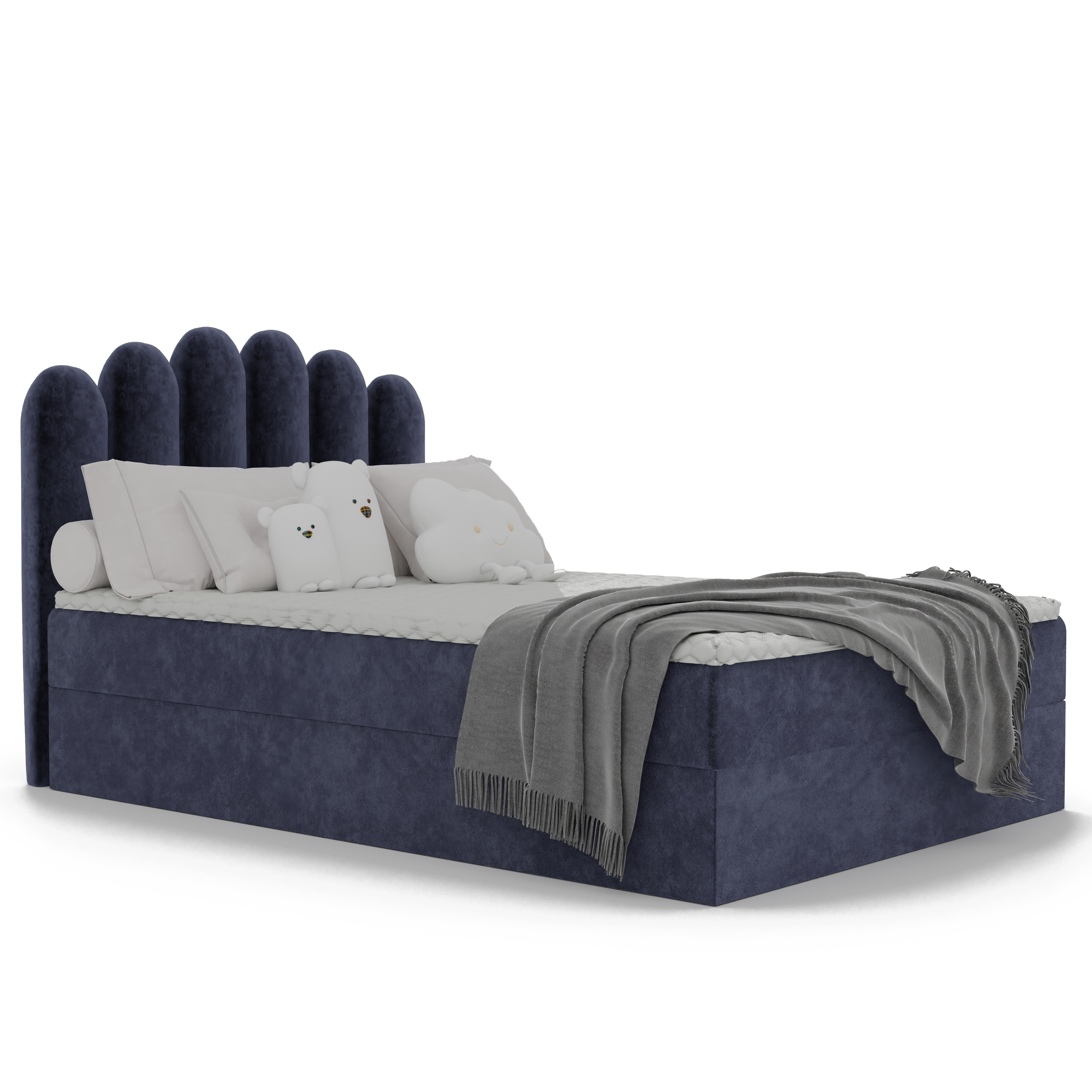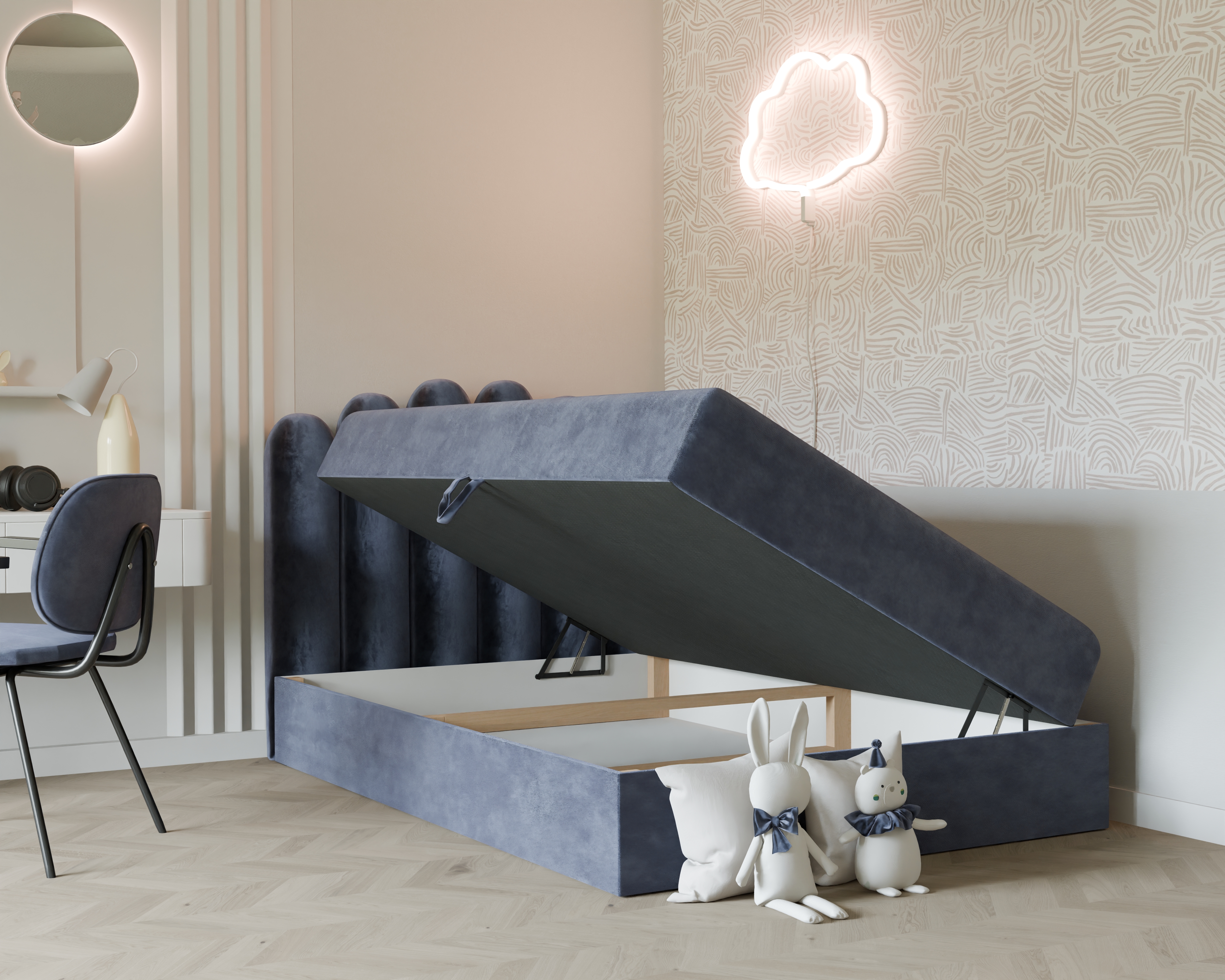 Łóżko wyposażone jest w wbudowany materac 7-strefowy na sprężynach kieszeniowych — zapewnia on właściwe podparcie ciała, dobrą wentylację i higienę snu. Dodatkowo konstrukcja posiada pojemnik na pościel otwierany na bok, co znacząco ułatwia organizację przestrzeni w pokoju.