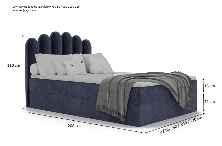 Dostępne są rozmiary powierzchni spania: 80×200, 90×200, 100×200, 120×200 cm. Wysokość całkowita łóżka oraz zagłówka można wybrać spośród wariantów 80 / 90 / 100 / 110 cm. Wysokość skrzyni wynosi 25 cm, wysokość materaca 18 cm, natomiast nóżki mają wysokość 1 cm — co daje niski profil i wygodne wejście. Strona zabudowy pojemnika: prawa lub lewa.