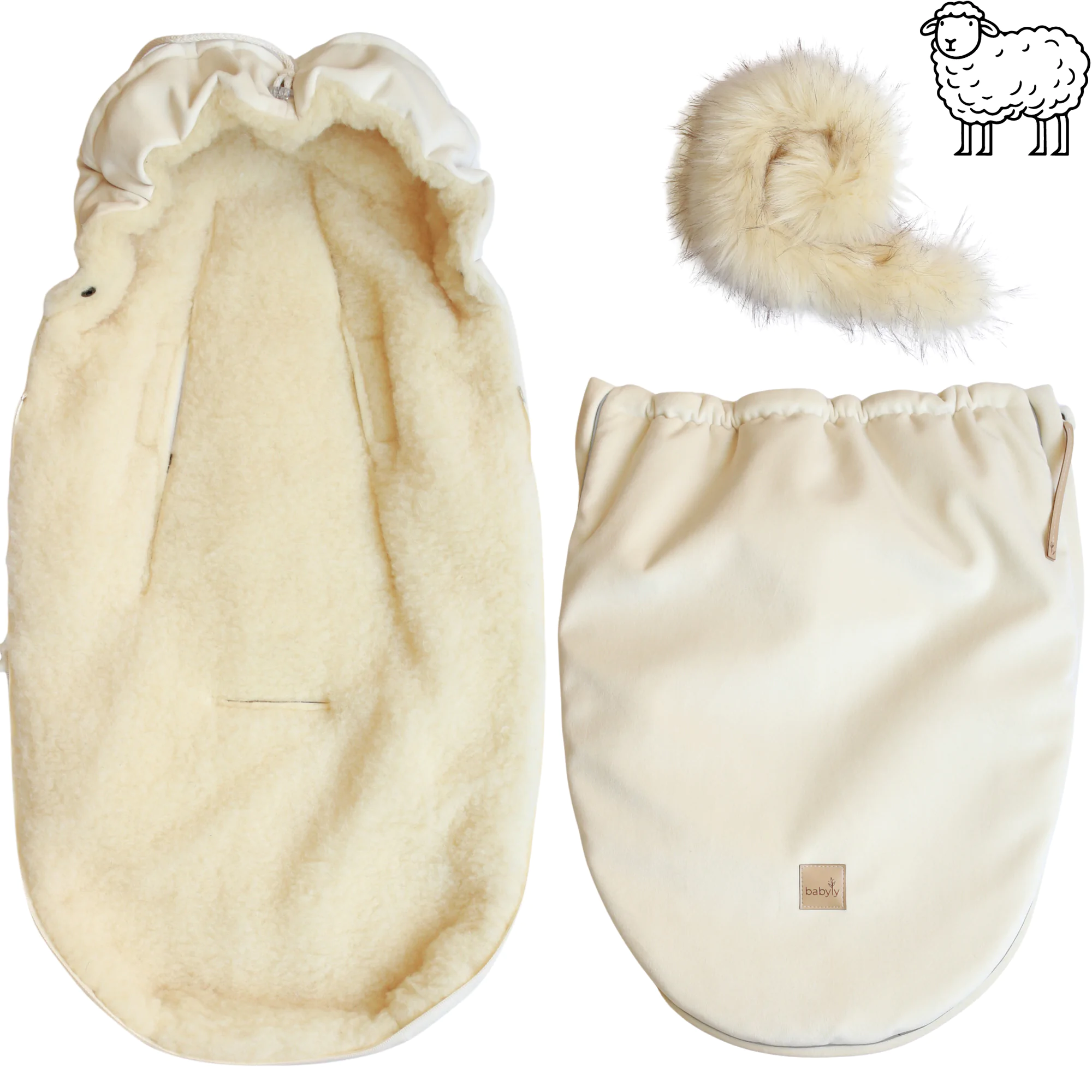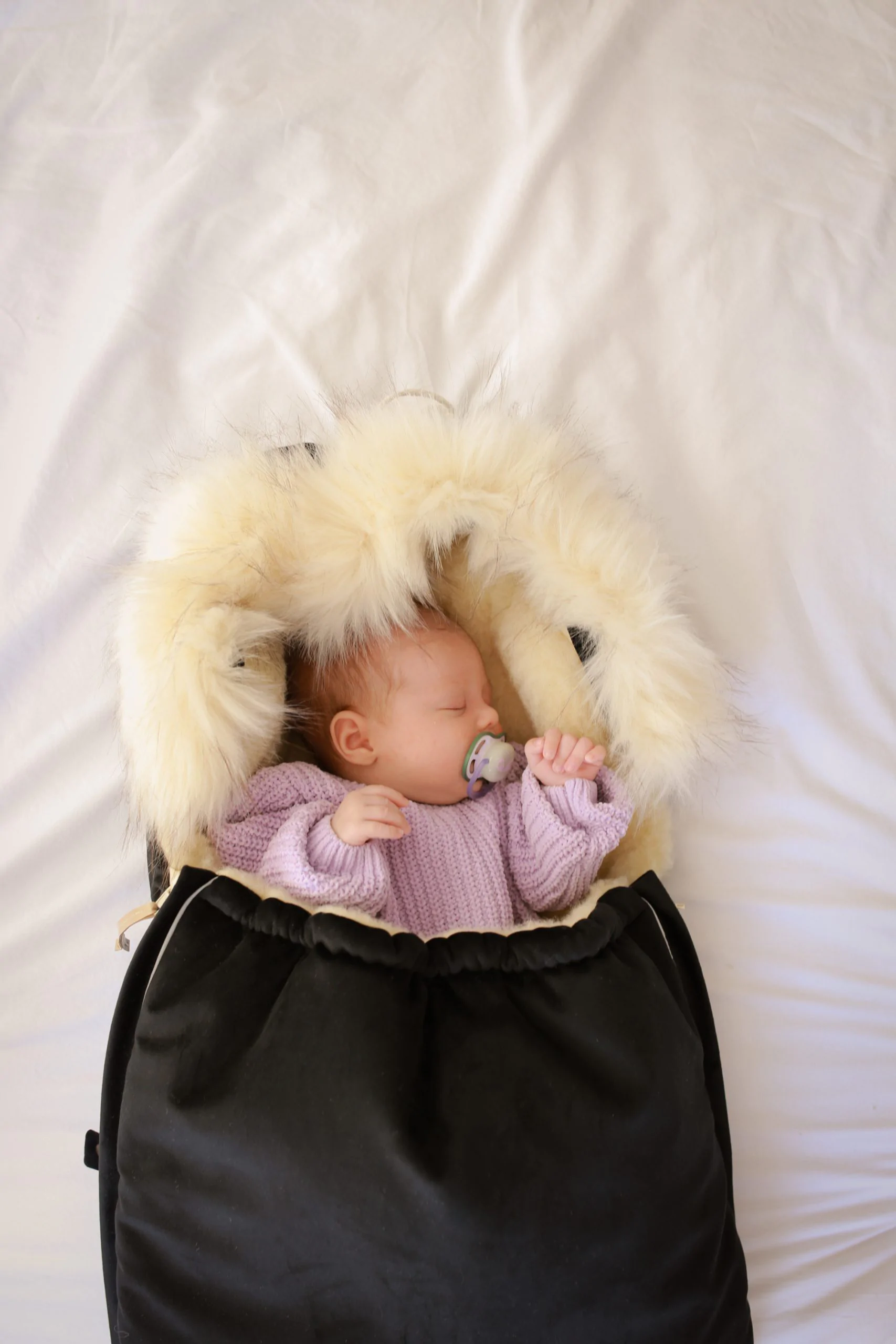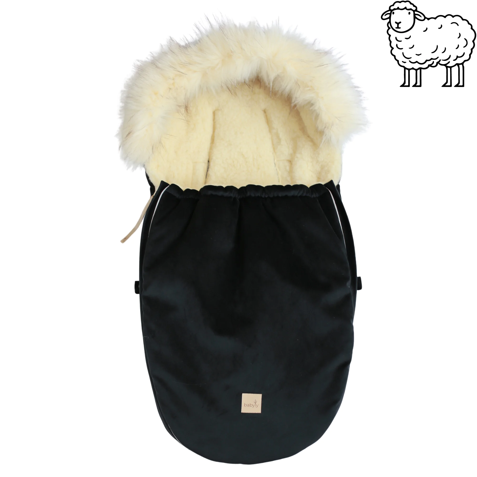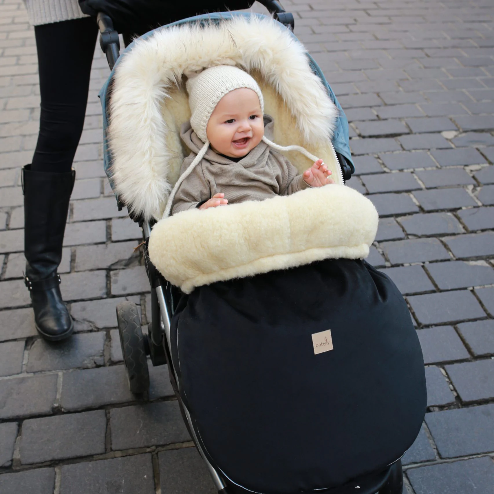 Elegancki, wełniany śpiworek do wózka w kolorze czarnym z odblaskiem i odpinanym futerkiem. Wodoodporny, ciepły i oddychający dzięki owczej wełnie. Dostępny w rozmiarach XS i XL – idealny na zimowe spacery.