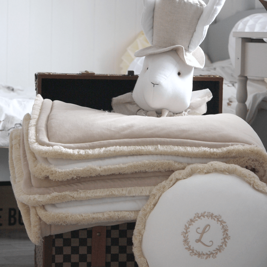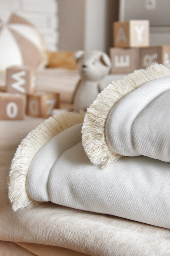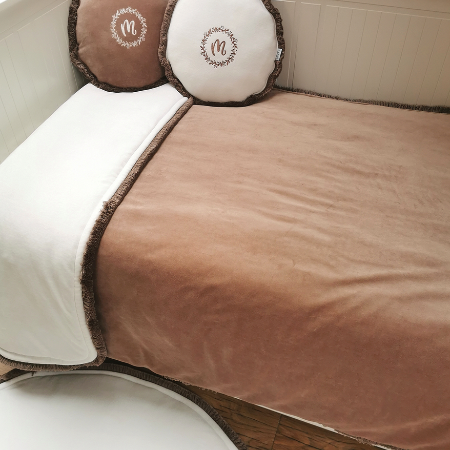 Ekskluzywna narzuta dziecięca z miękkiego weluru, z dekoracyjnymi bawełnianymi frędzlami wszytymi wokół brzegów – dwustronna - możliwość wybrania wersji jedno lub dwukolorowej. Wypełniona antyalergiczną włókniną, od razu gotowa do udekorowania pokoiku.