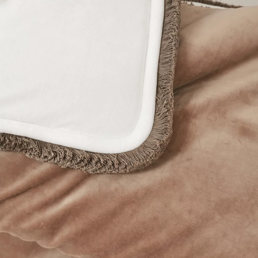 Ta narzuta łączy w sobie miękkość i luksus weluru z przepikowaną konstrukcją, dzięki której wypełnienie pozostaje na swoim miejscu, nawet podczas prania. Frędzle dodają dekoracyjnego akcentu, a dwustronny welur umożliwia wybór koloru według nastroju lub aranżacji wnętrza.