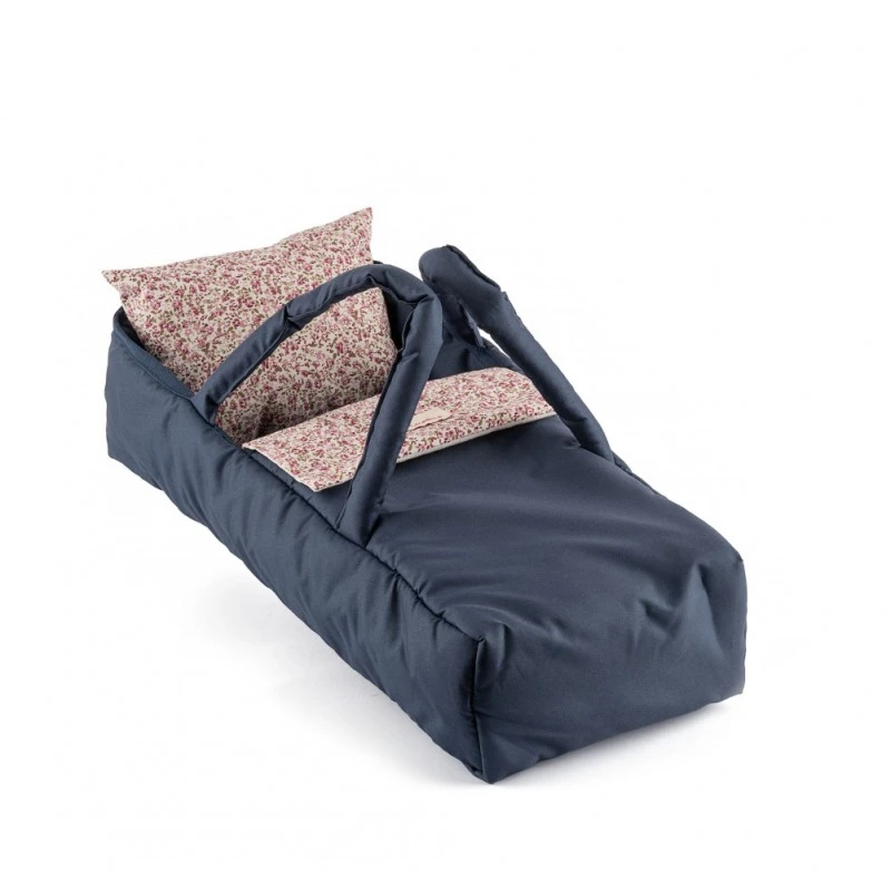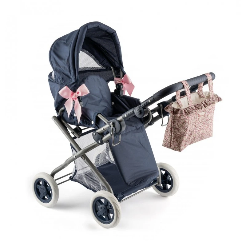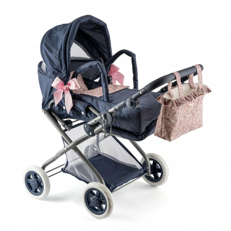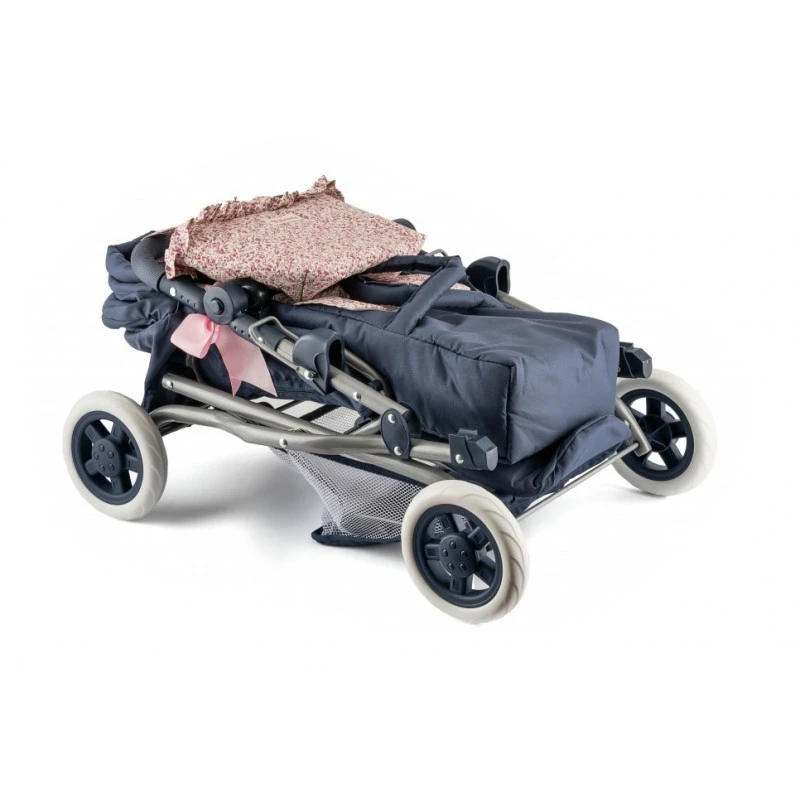 Granatowa kolorystyka w połączeniu z subtelnym motywem kwiatowej łąki nadaje wózkowi wyjątkowego charakteru, czyniąc go nie tylko zabawką, ale również stylowym dodatkiem do pokoju dziecięcego.