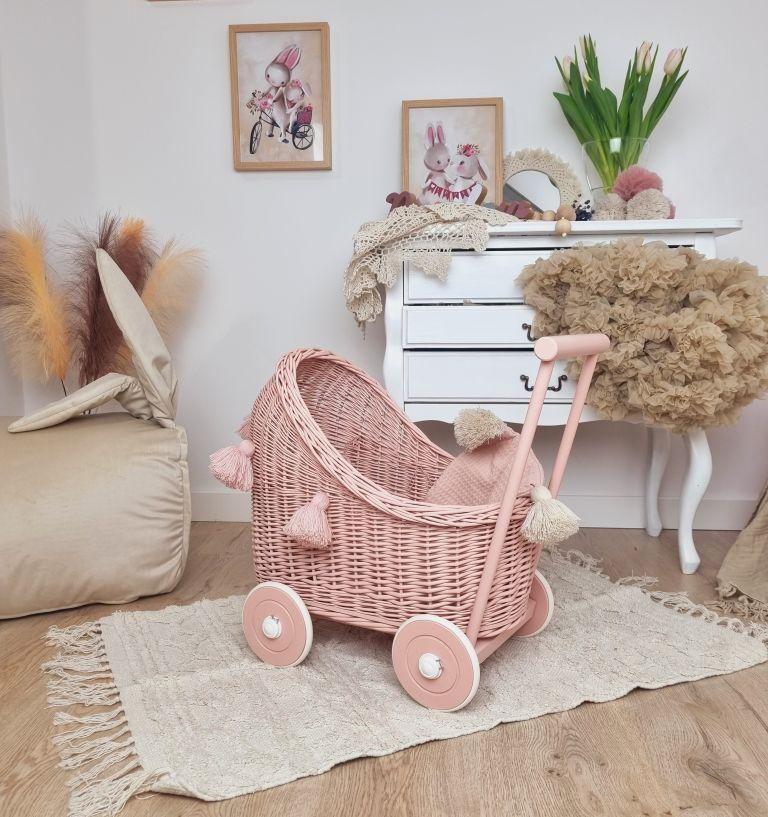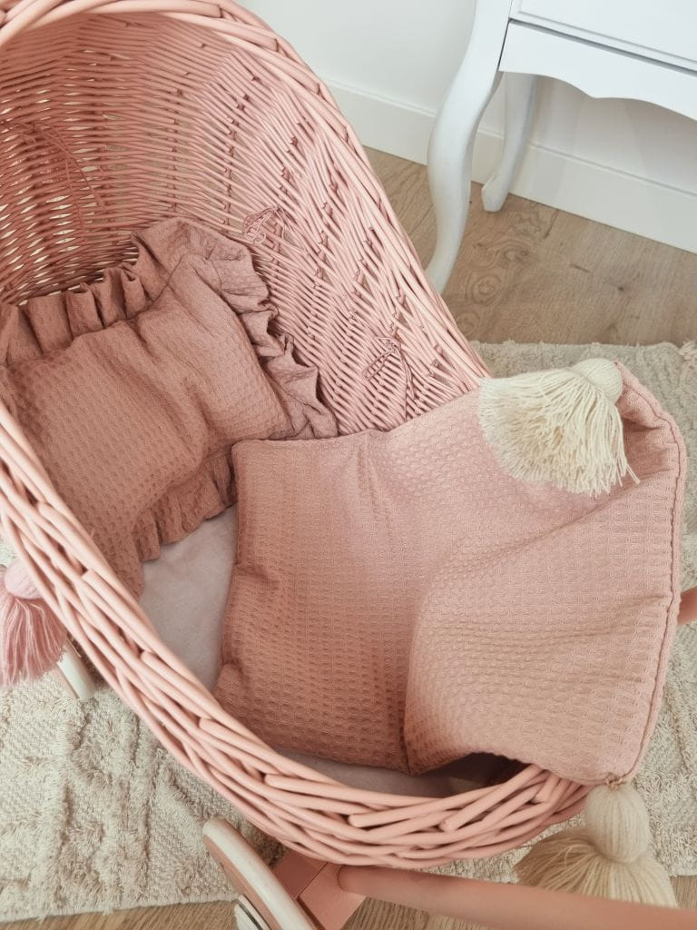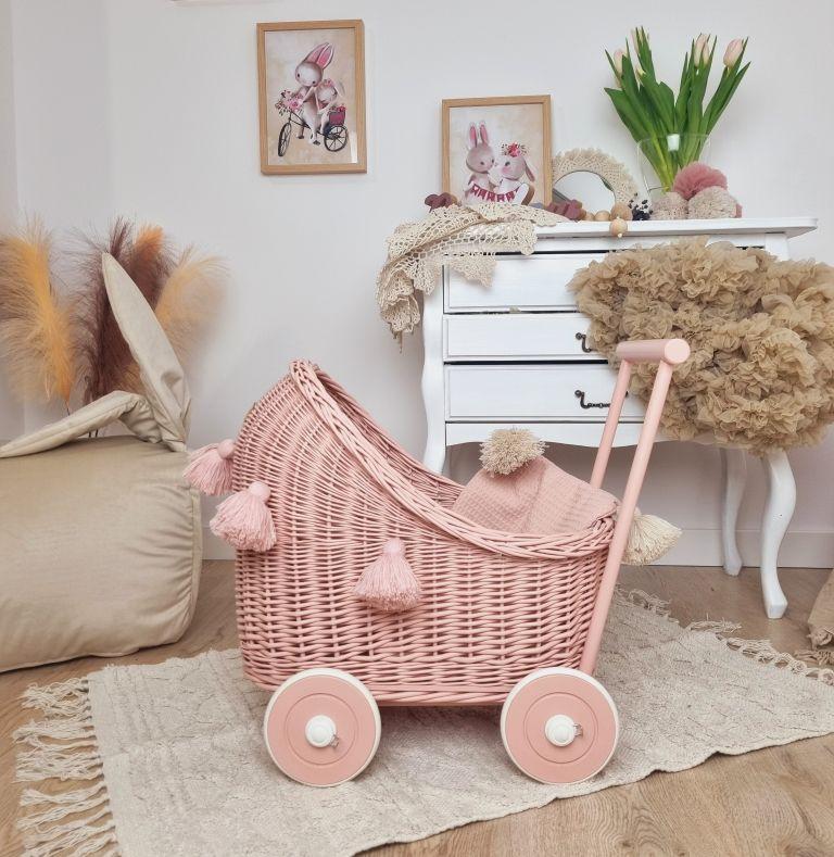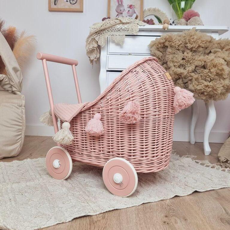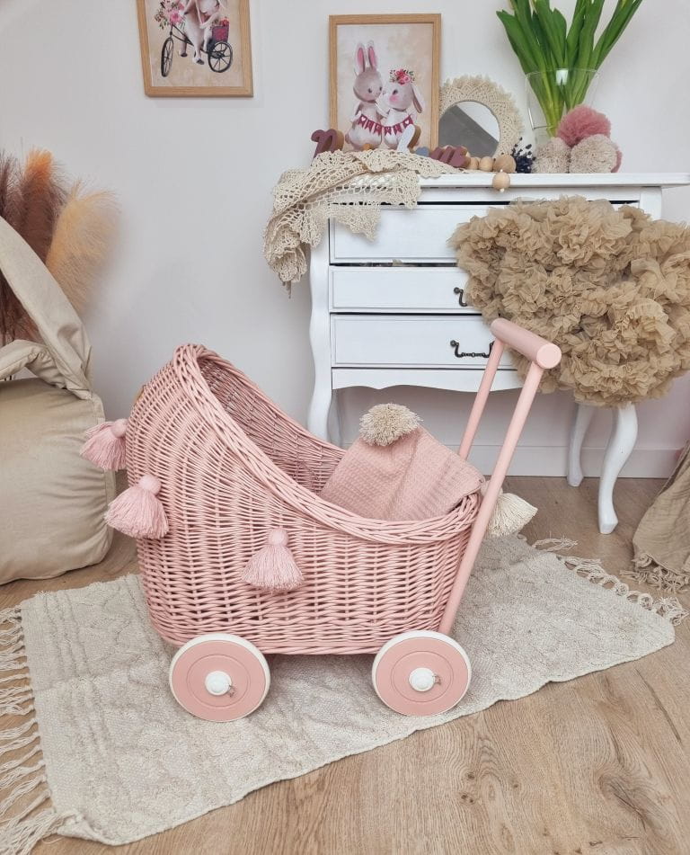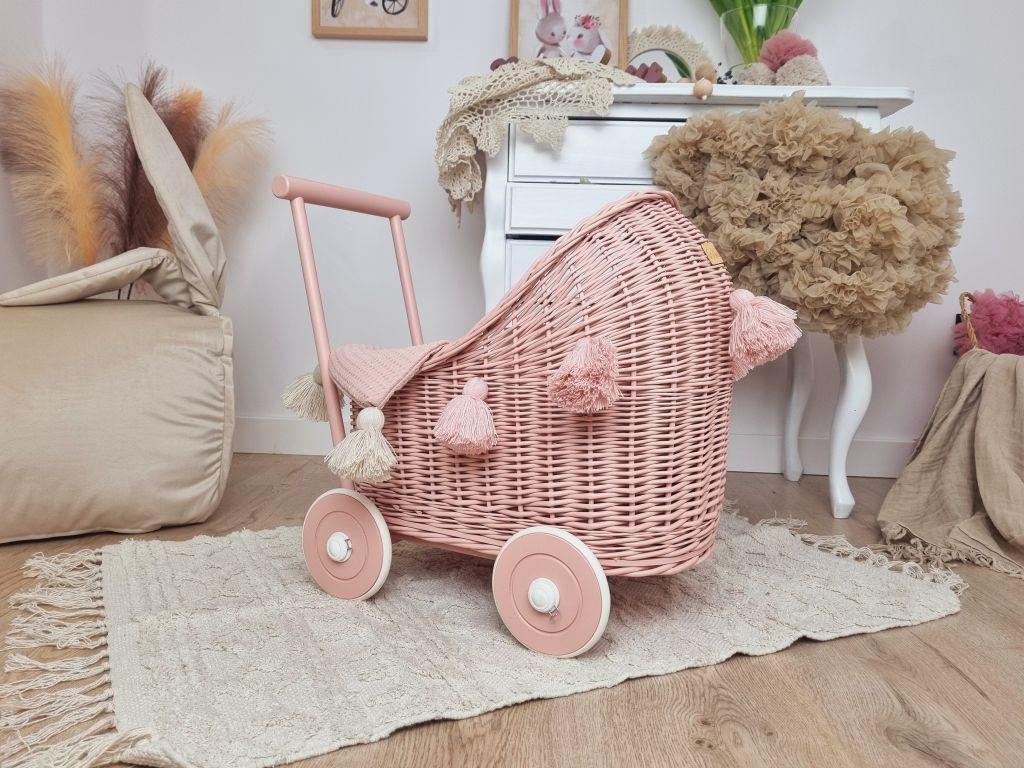 Wózek wiklinowy dla lalek pchacz brudny róż z chwostami i pościelą brudny róż