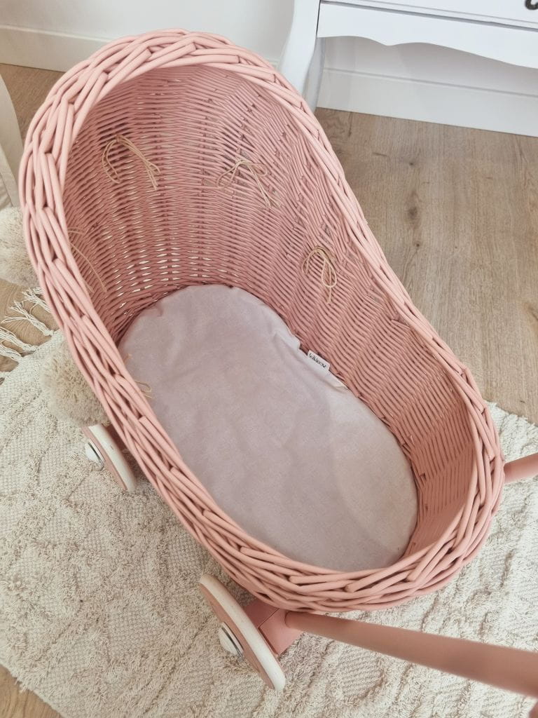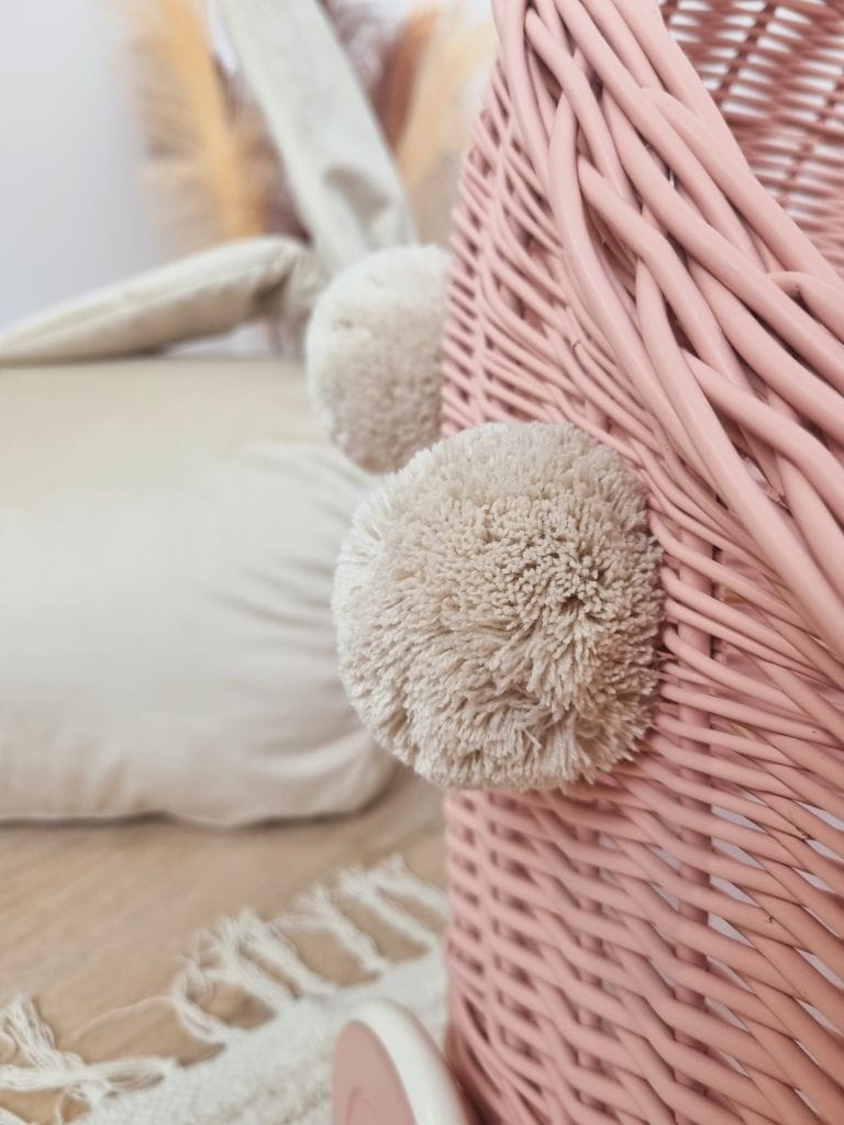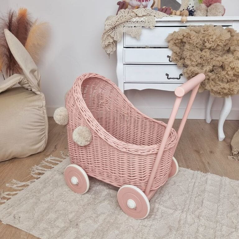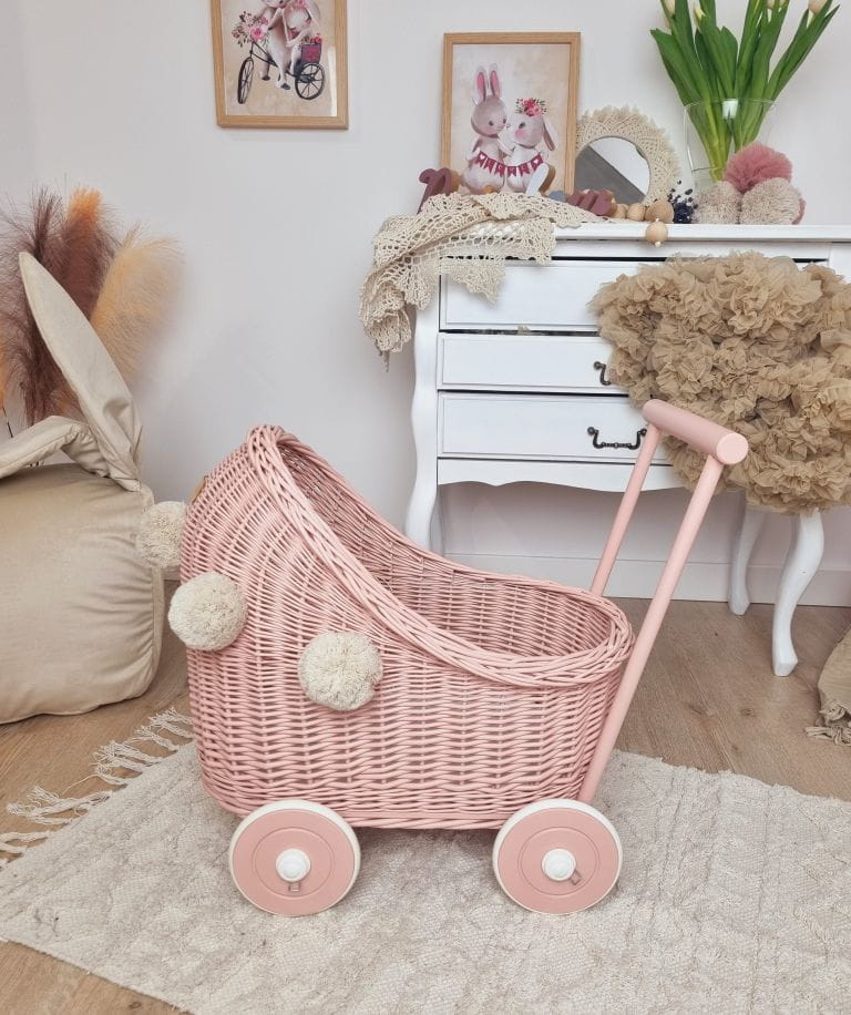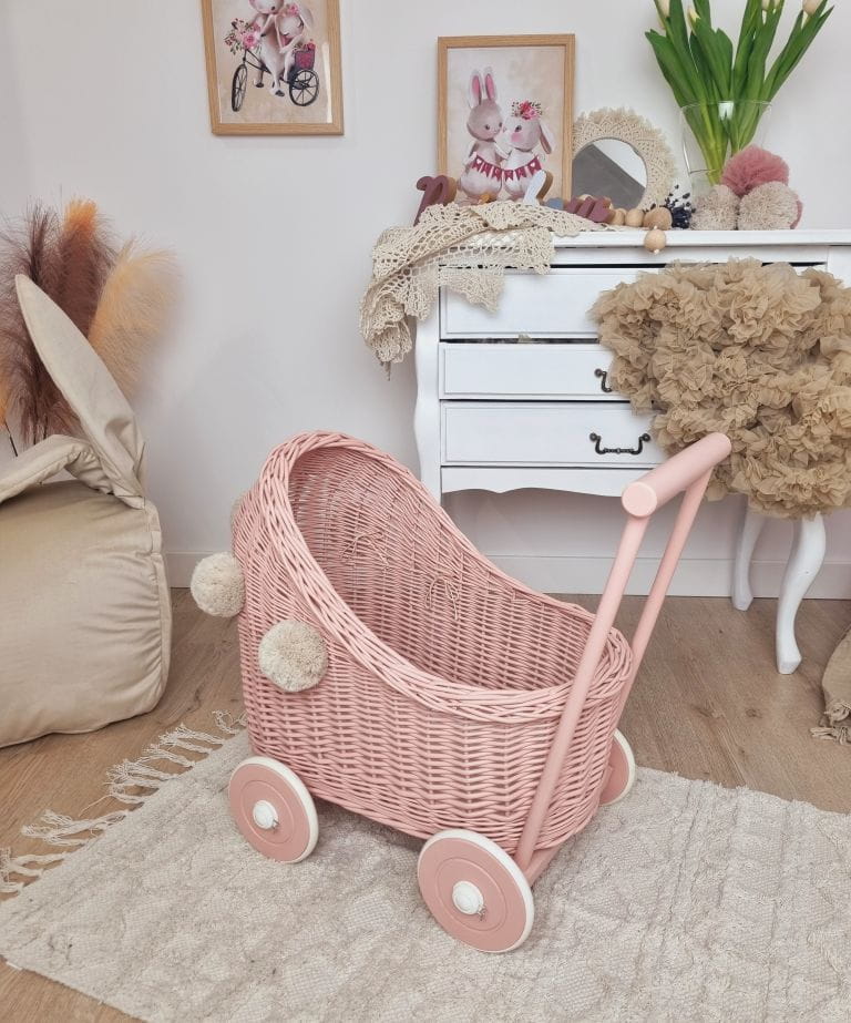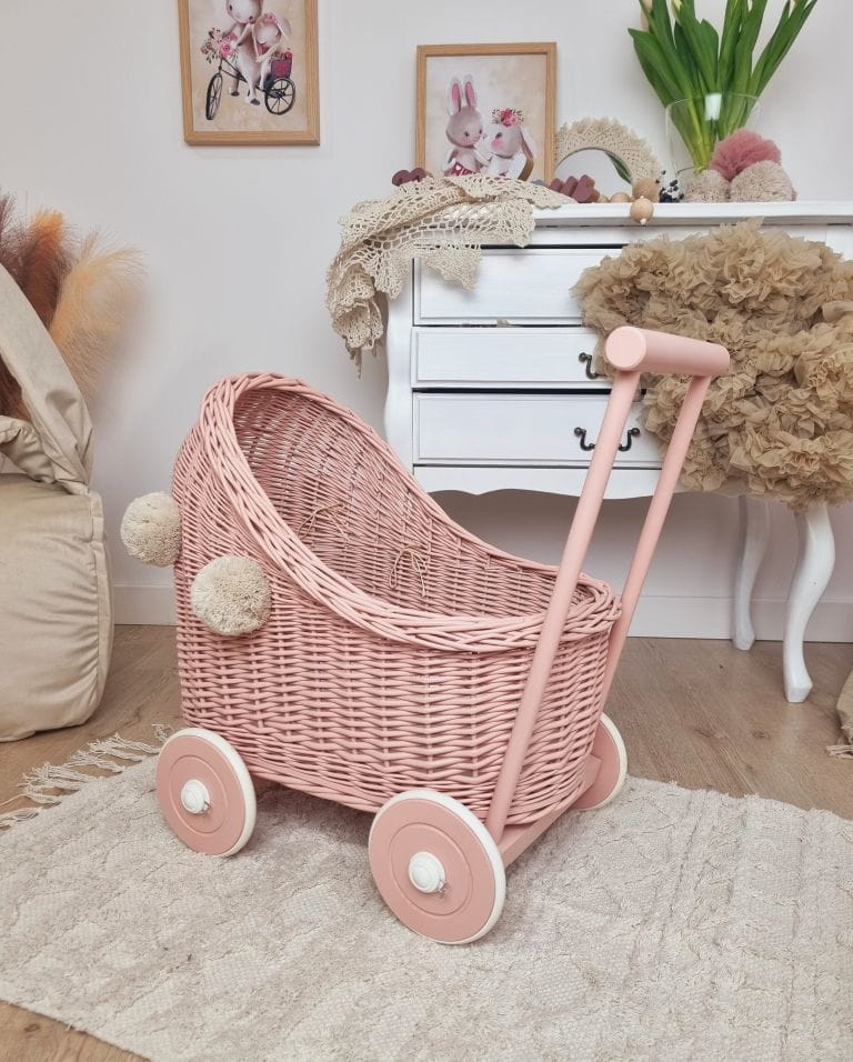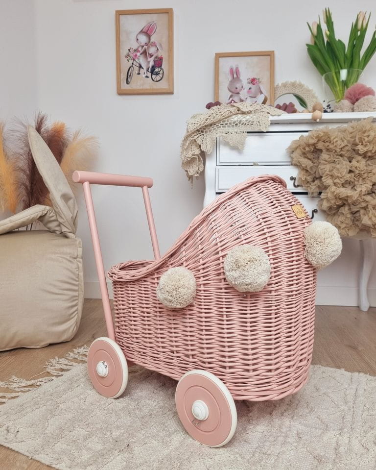 Wózek wiklinowy dla lalek pchacz brudny róż z pomponami brudny róż