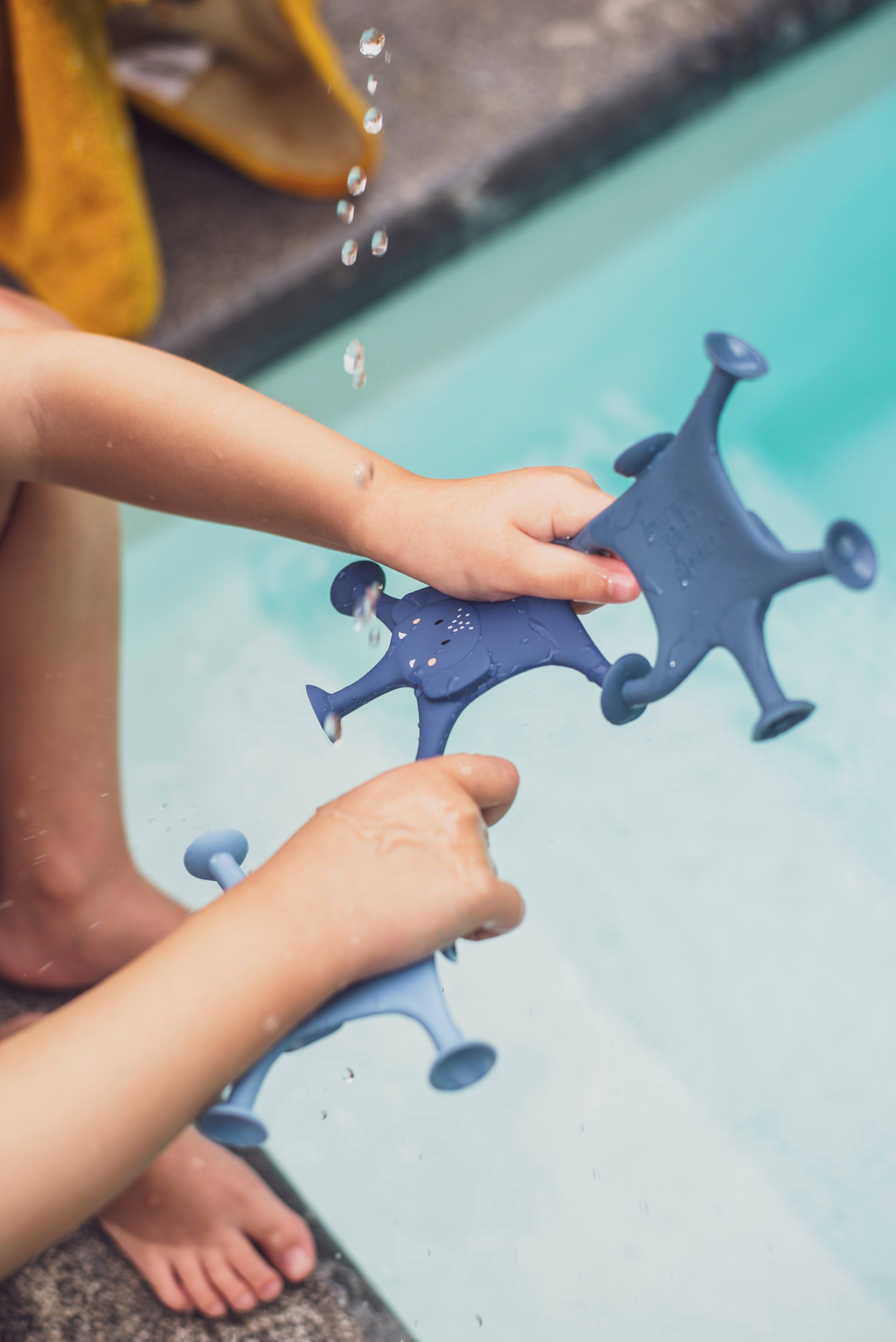 Dołącz do zabawy z wesołą rodziną słoni, które unoszą się w wannie i zapewnią doborowe towarzystwo dziecku podczas kąpieli. Dzięki przyssawkom maluchy mogą cieszyć się zabawą w przyklejanie ich do ścian, czy wanny oraz łączenie niebieskich słoników. Skład: 100% silikon Zalecany wiek: 12m+ Wymiary: 10 x 9,5 x 2 cm