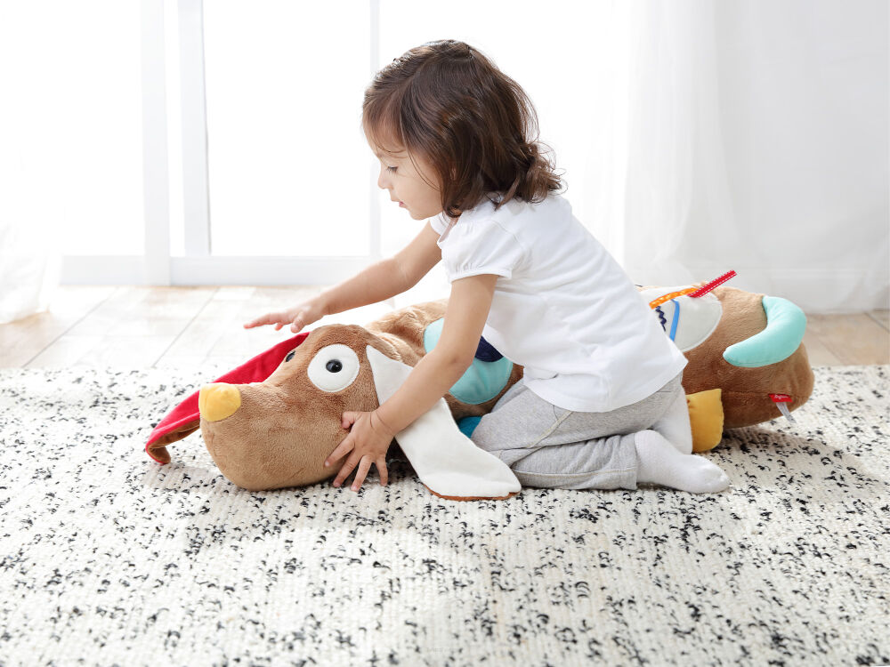 Dzięki długości 80 cm, piesek jest nie tylko zabawką rozwojową, ale również: