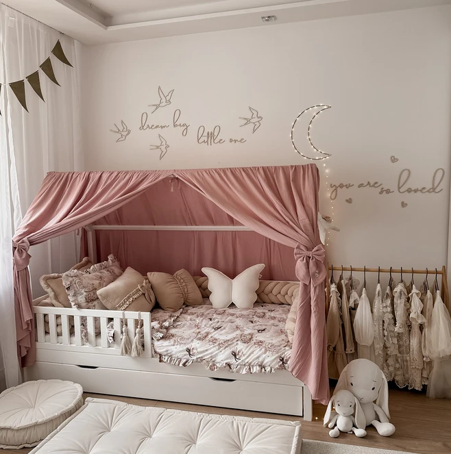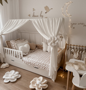 Zasłonki muślinowe w naturalnym stylu to nie tylko dekoracja — to delikatny element tworzący intymny, spokojny kącik idealny do snu, zabawy i relaksu. Wysoka jakość wykonania i przyjazne materiały sprawiają, że to doskonałe uzupełnienie każdego pokoju dziecięcego.