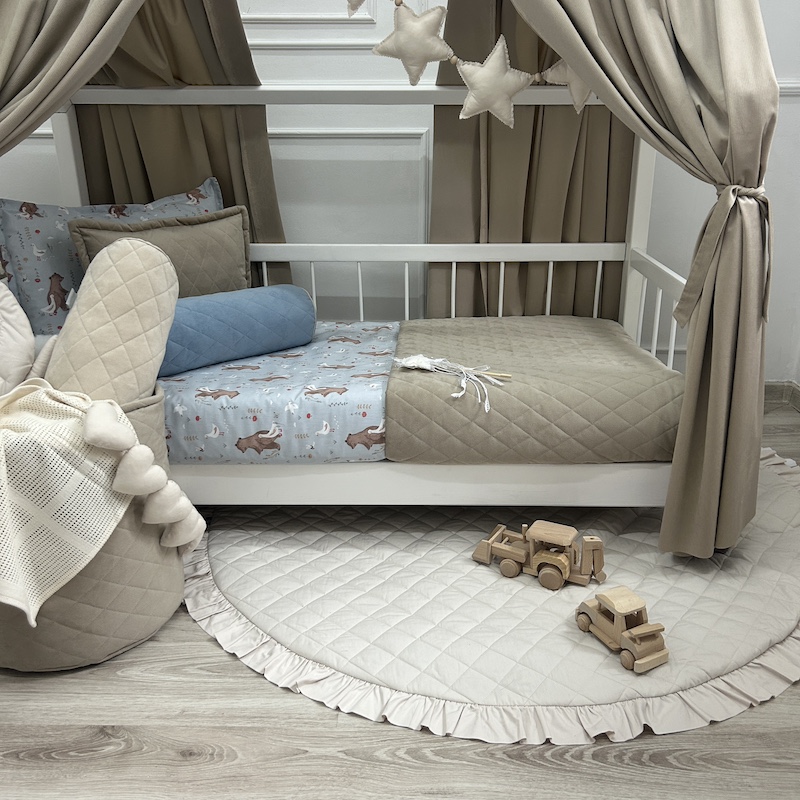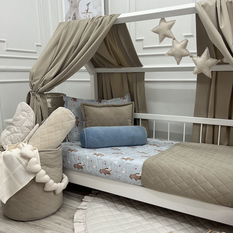 Zasłonki / baldachim Velvet Beżowy to elegancka, miękka dekoracja, która nadaje łóżeczku domek przytulny i harmonijny charakter. Wykonane z wysokiej jakości tkaniny velvet, zasłony pięknie się układają i wprowadzają do pokoju dziecka subtelną, ciepłą atmosferę.