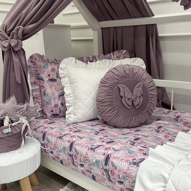 Aksamitny baldachim tworzy delikatną, otulającą osłonę nad łóżeczkiem, zapewniając dziecku poczucie bezpieczeństwa i komfortu. Zasłony tłumią nadmiar światła, dzięki czemu w łóżeczku domek powstaje przyjemny klimat idealny do zasypiania, wyciszenia oraz kreatywnej zabawy.