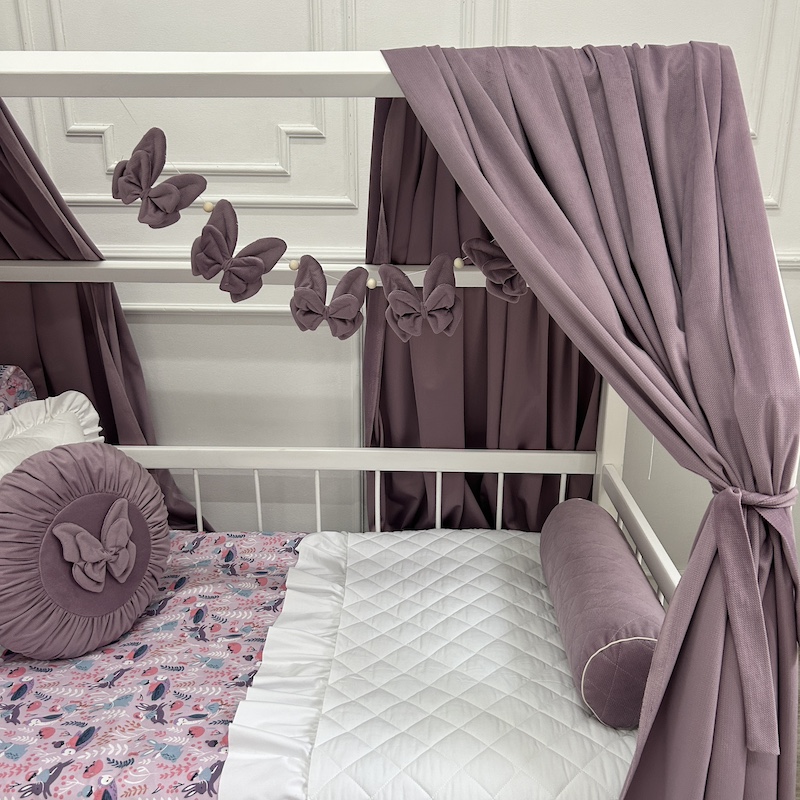 Zasłonki / baldachim do łóżeczka domek Velvet Jagoda to niezwykła dekoracja, która łączy w sobie elegancję, funkcjonalność i przytulny charakter. Wykonany z wysokiej jakości tkaniny velvet, zachwyca miękkością, subtelnym połyskiem oraz intensywnym, jagodowym odcieniem, który pięknie komponuje się z wystrojem pokoju dziecka.