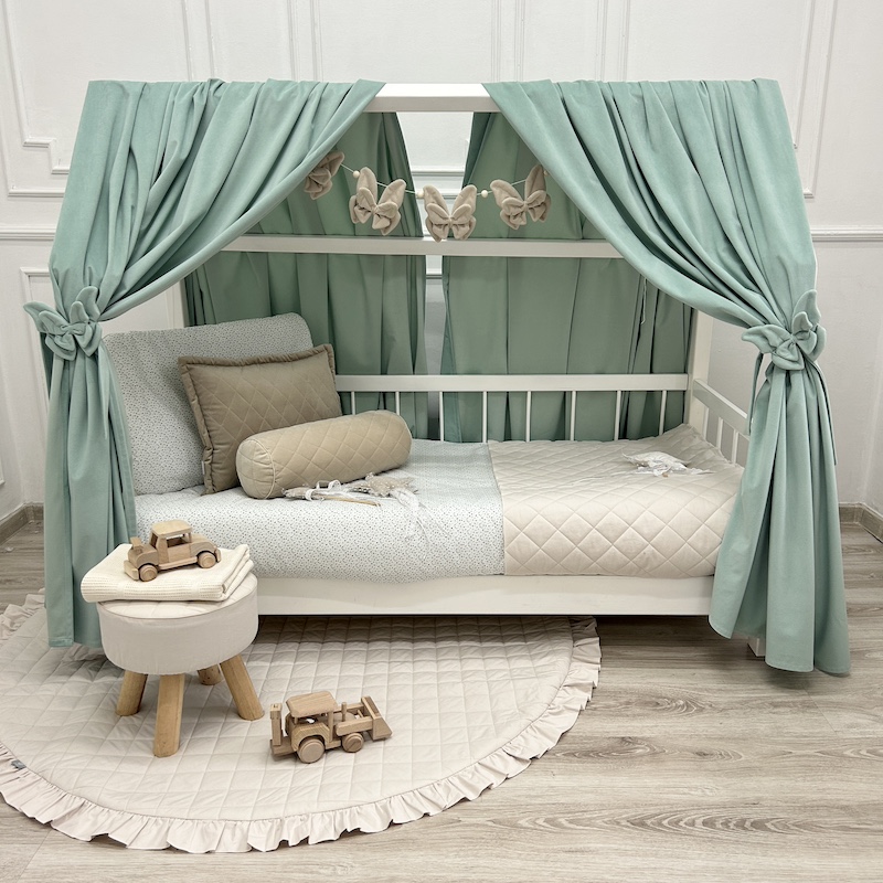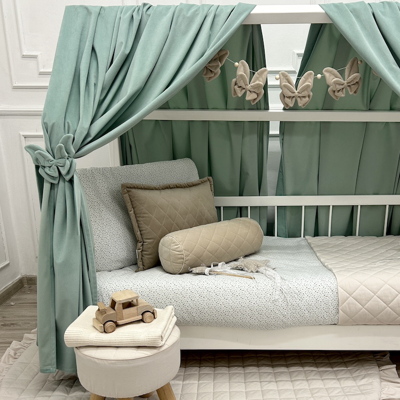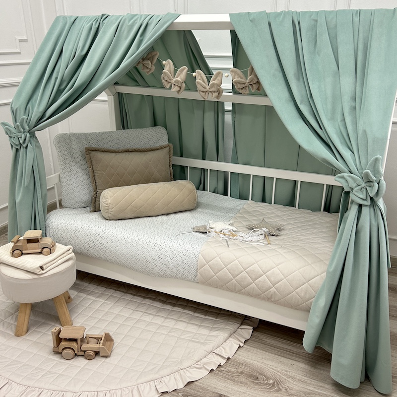 Aksamitne zasłonki / baldachim Velvet Mięta do łóżeczka domek tworzą przytulną, zaciszną przestrzeń do snu i zabawy. Miękki velvet pięknie się układa, dodając wnętrzu elegancji i bajkowego charakteru.